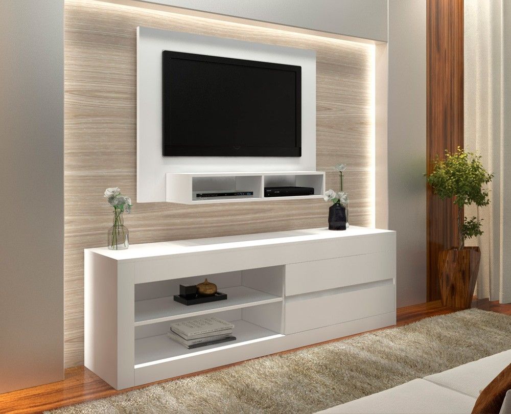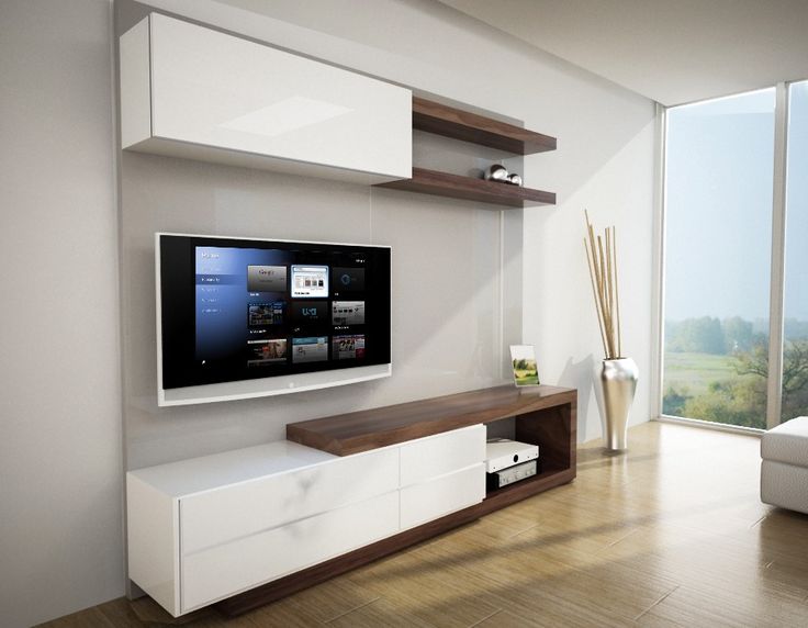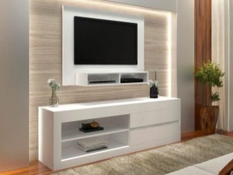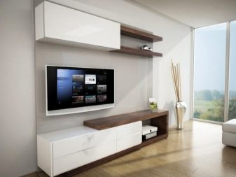 - За да инсталирате телевизор, можете да вземете нощно шкафче, да поставите рафт. Можете също така да изберете всяка хоризонтална повърхност - основното е, че тя може да издържи теглото на оборудването. Можете да играете с контраст и да изберете мебели в противоположната цветова схема. Черен телевизор ще изглежда страхотно в дует със снежнобял шкаф.