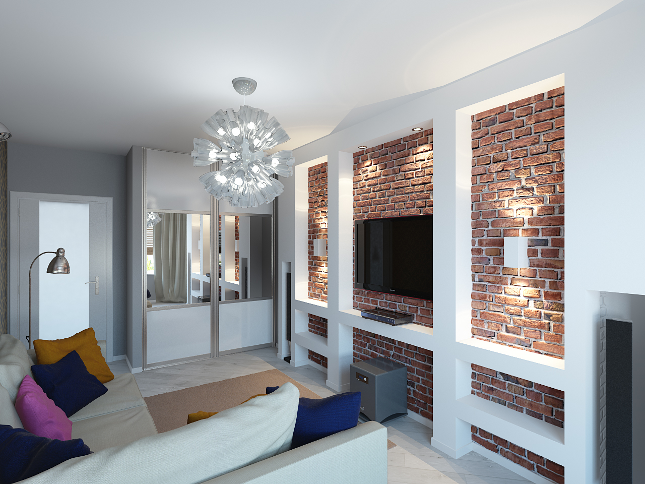 - Телевизор, инсталиран в ниша, изглежда спретнат и практичен. Можете да го подредите с дърво или гипсокартон. Когато избирате материал, трябва да вземете предвид стила на интериора. За малка стая е подходяща ниша със стъклени вложки или гладка повърхност, която отразява светлината. Причудлива игра на отблясъци ще направи стаята визуално по -просторна.