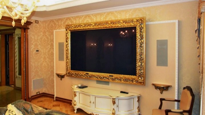 - Ако стаята е декорирана в класически стил (рококо или барок), можете да рамкирате телевизора с изящна златна рамка. Препоръчително е да изберете оригинална версия на естествено дърво с обемни резбовани елементи. За да изглежда този декор възможно най -ефективен, можете да украсите стаята с картини в същите позлатени рамки.