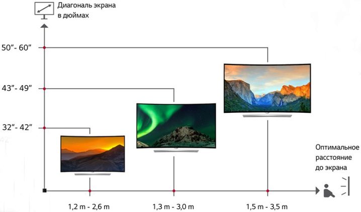 Когато инсталирате LCD монитори, вземете предвид размера на екрана. Разстоянието от човек до телевизора трябва да бъде 2 или 3 пъти по -голям от диагонала. Помислете за пример, когато диагоналът на екрана е 32 инча. Умножаваме това число по 2 или 3, получаваме съответно 64 и 96. За удобство получените цифри могат да бъдат преобразувани в познати за нас сантиметри, оказва се 162 или 264 сантиметра.