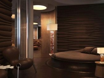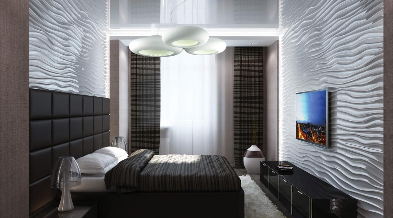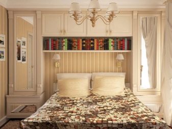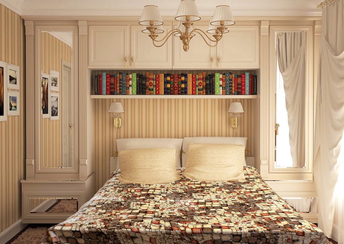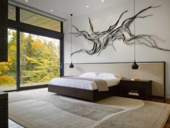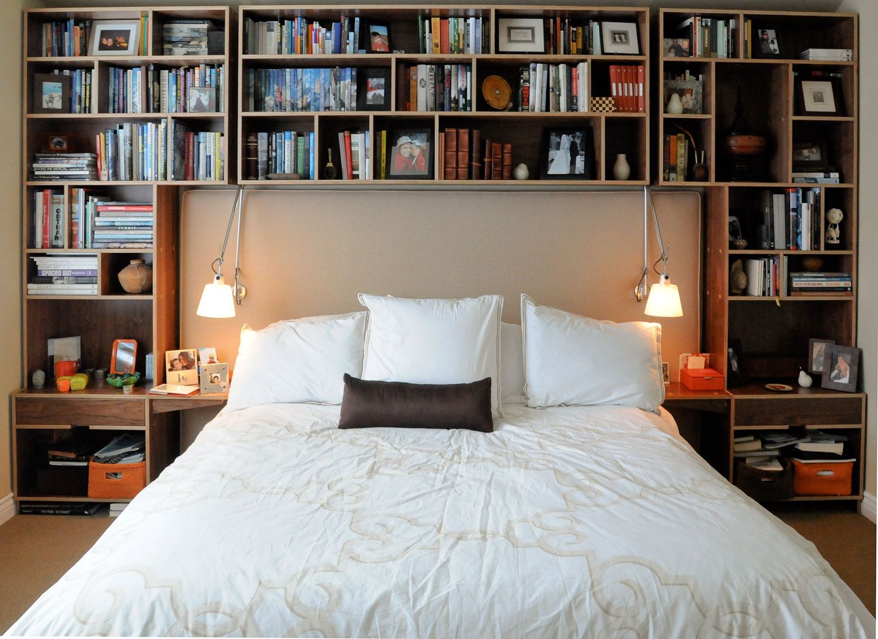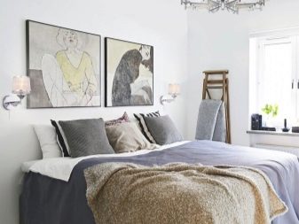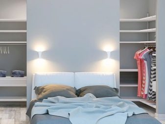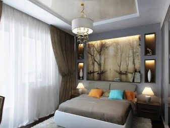 В допълнение към светлината, декорът в спалнята също трябва да бъде обмислен. Особено внимание трябва да се обърне на стената зад главата на леглото. На това място често се монтират рафтове, на които се поставят различни: