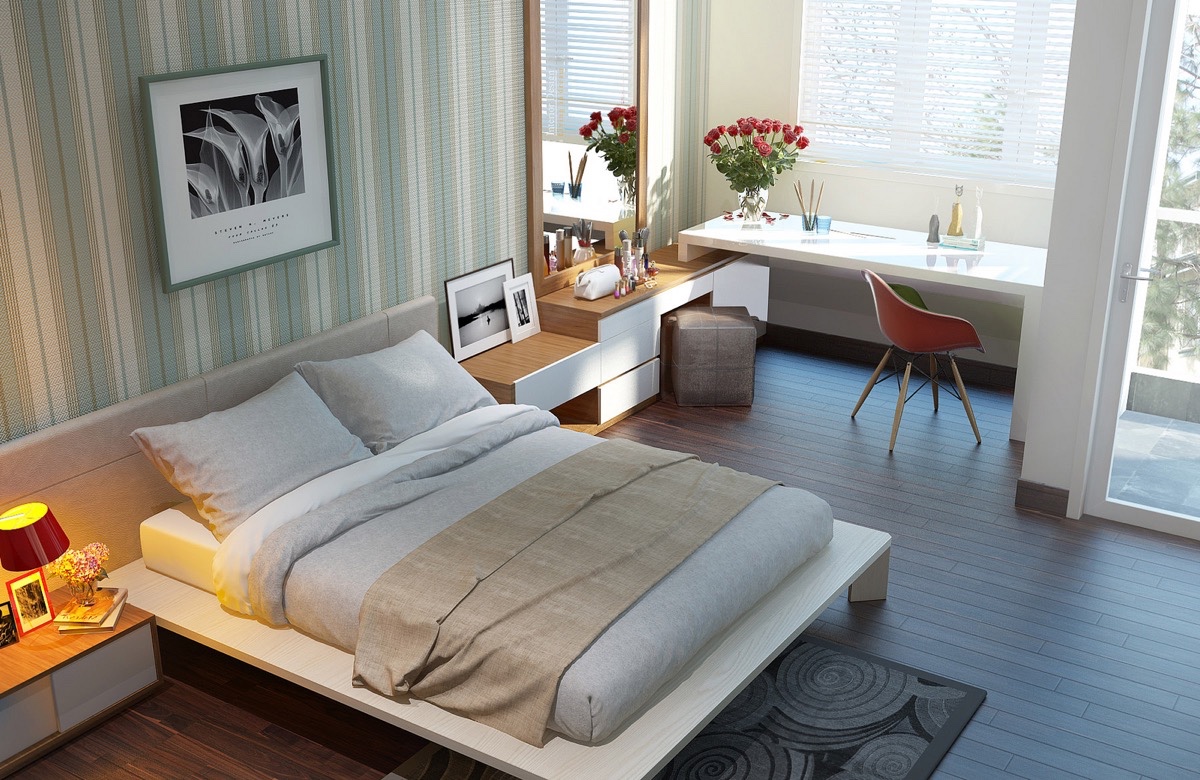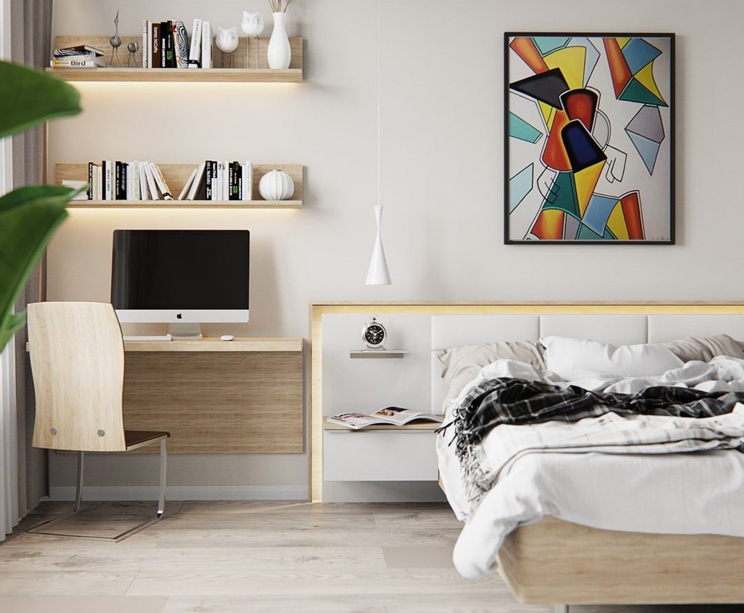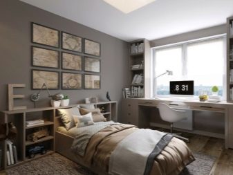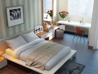 - Работещи. В някои спални, ако пространството позволява, можете да осигурите малка работна зона, която ще действа като маса и стол.