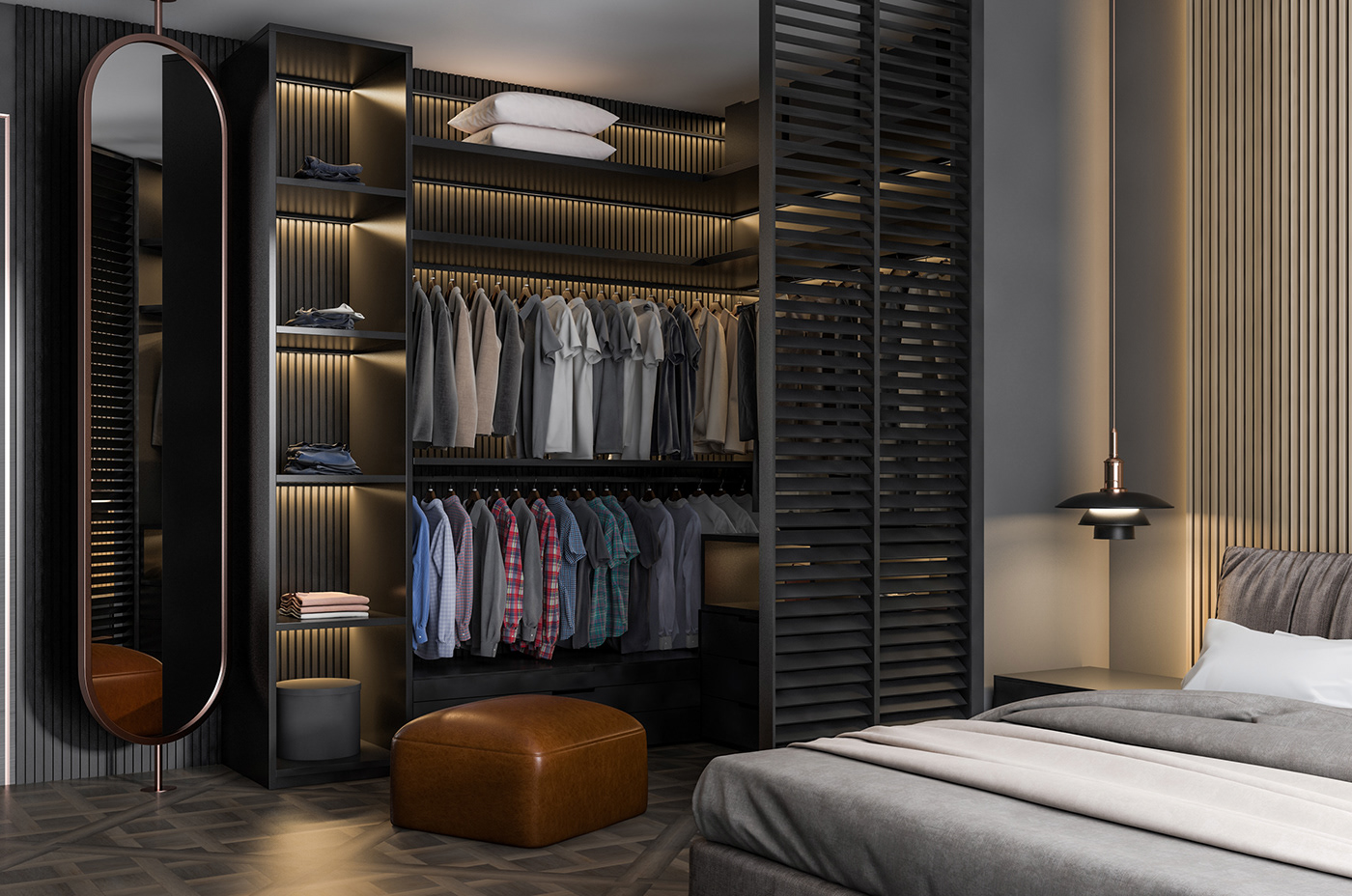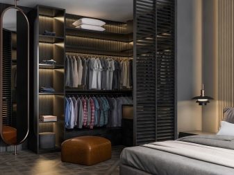 Във високотехнологичните стаи ще бъде удобно да се поставят три зони наведнъж: съблекалня, спалня и работна зона.