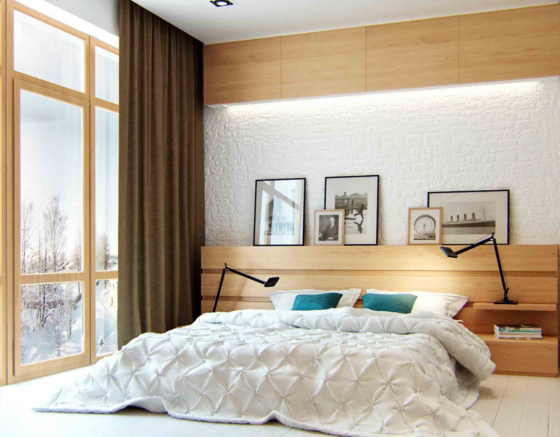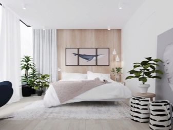 Украса за спалня в скандинавски стил. Всичко тук е просто, хармонично и доста уютно. Голям прозорец заслужава специално внимание, което осигурява достатъчно проникване на естествена светлина в стаята. В допълнение, белите нюанси в дизайна визуално правят стаята по -широка.