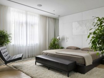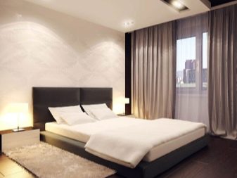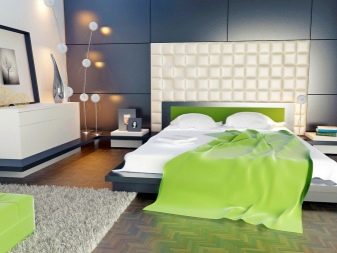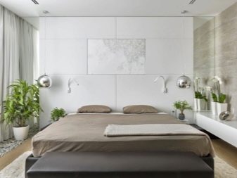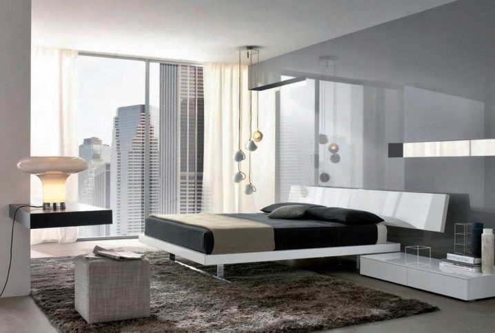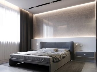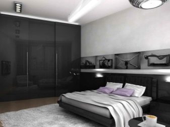 Интериорният дизайн в модерен високотехнологичен стил ще бъде добро решение за спални в малки площи. Черно -бяла декорация на стаята, наличието на малки ярки елементи за акценти. Други характеристики на стила:
