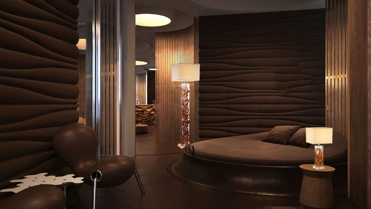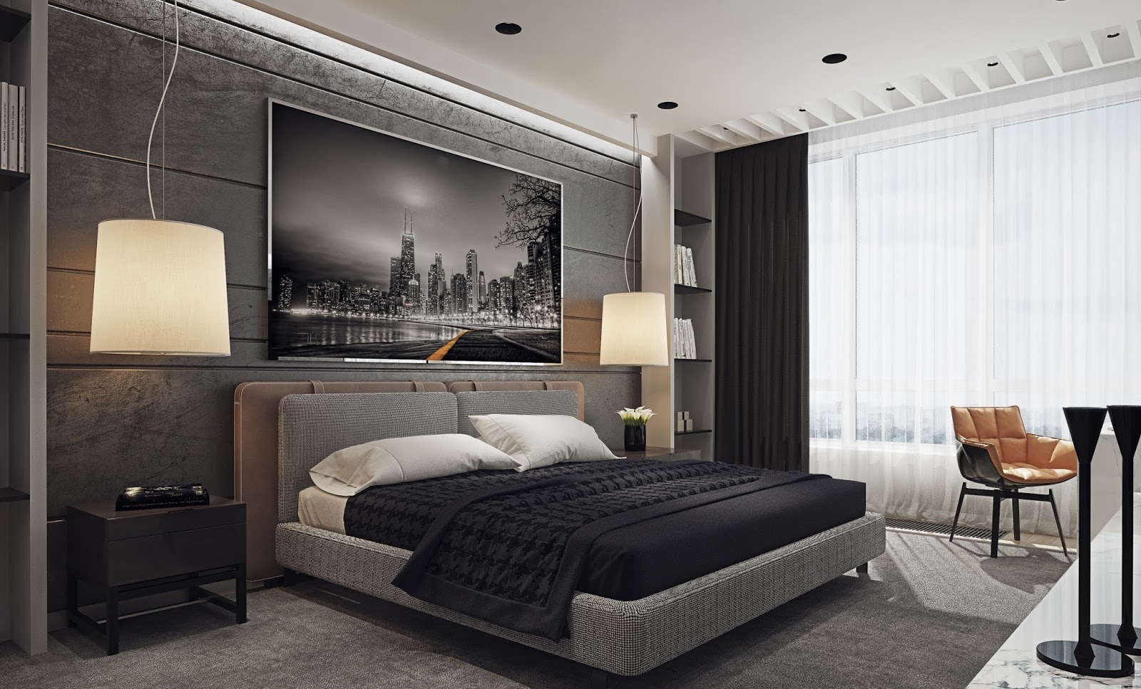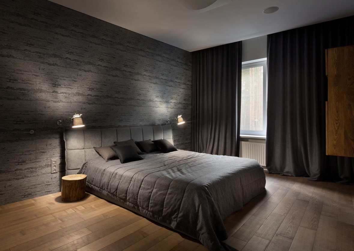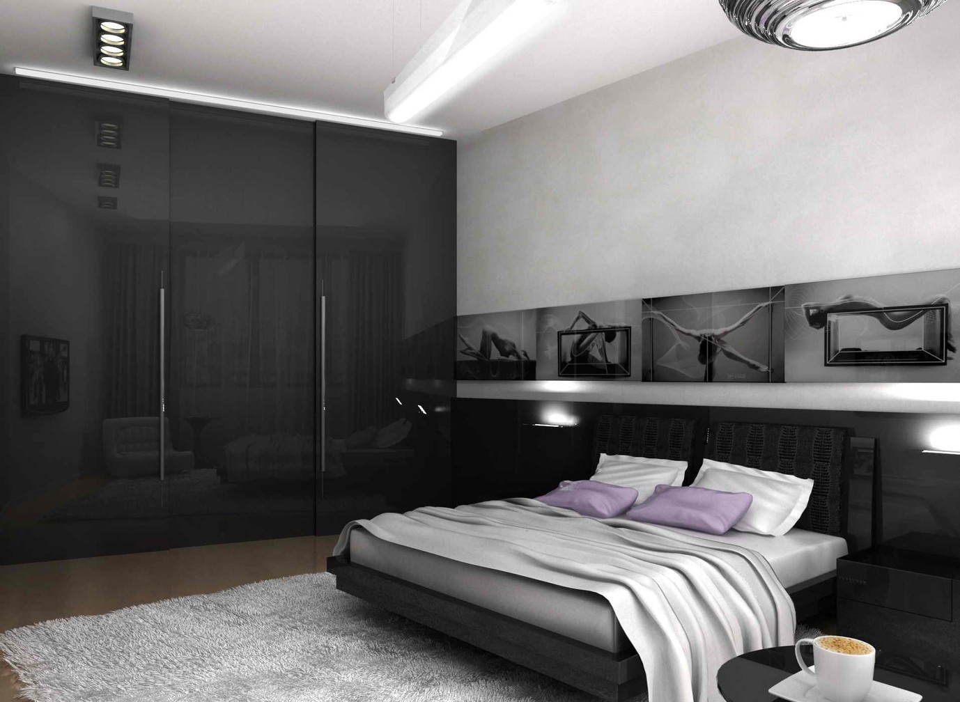 Високотехнологична спалня. Тук дизайнът е по -тъмен, но в същото време стаята се оказа стилна и, колкото и да е странно, уютна. В същото време дизайнерът успя да осигури работна зона и зона за отдих.