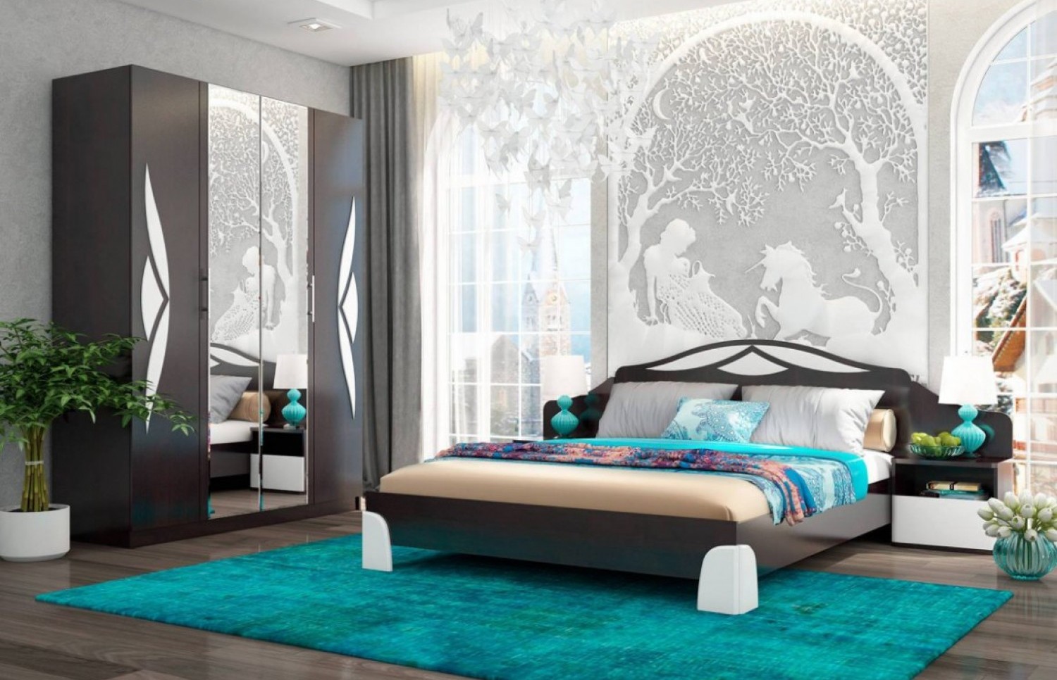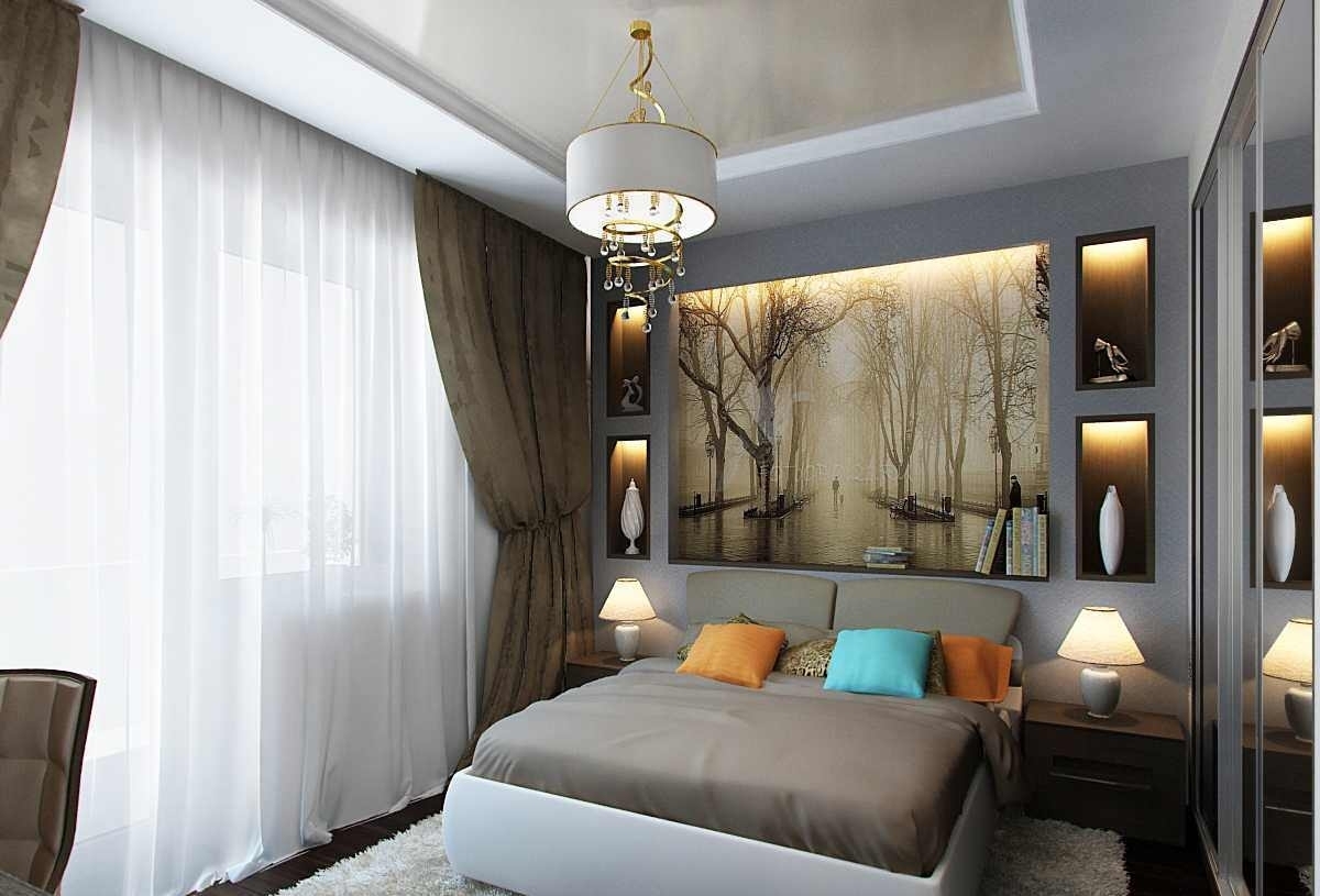 На стената на спалнята можете да поставите телевизор, фотографии или картини, за които няма място на повърхността на мебелите. В същото време се препоръчва да не се прекалява с покупката на декоративни елементи, така че стаята да не е претрупана.