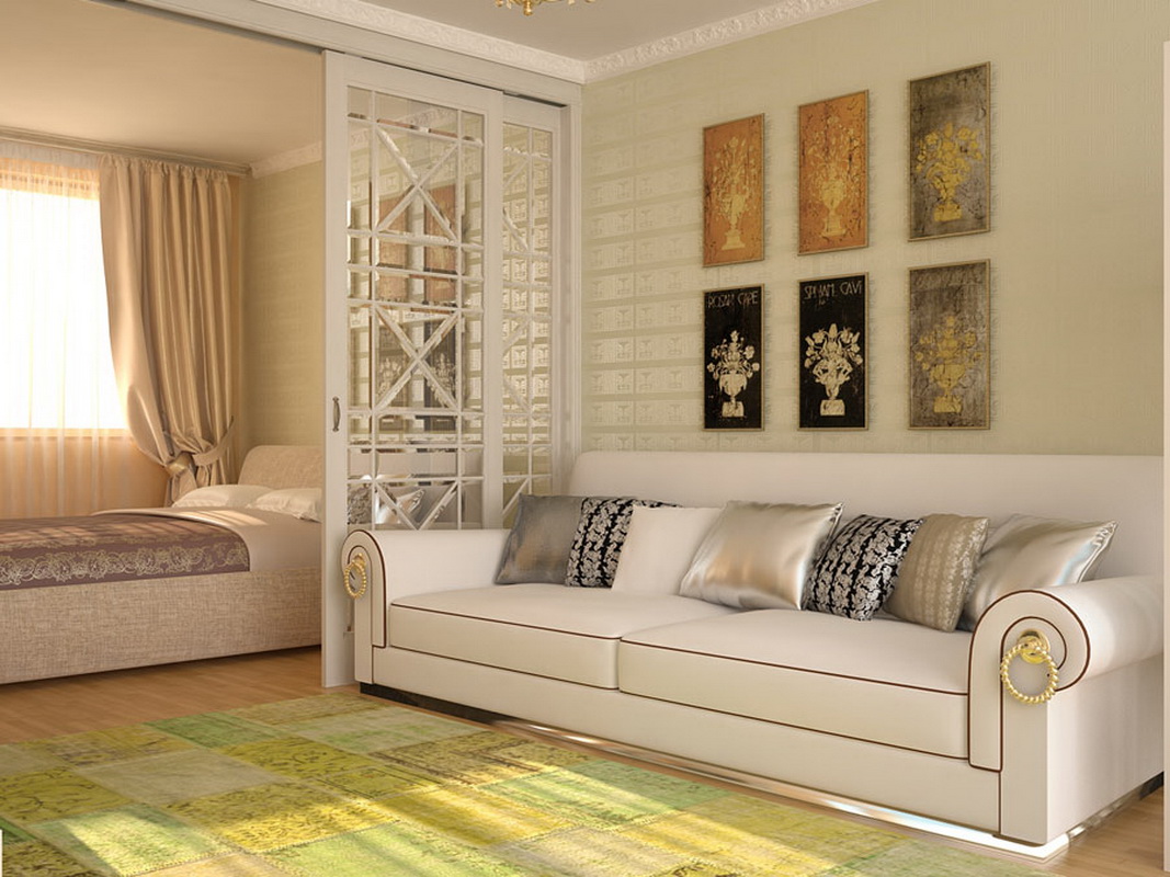 Такова решение ще позволи да се постигне визуално разширяване на пространството и ще осигури на стаята необходимото количество светлина през нощта.