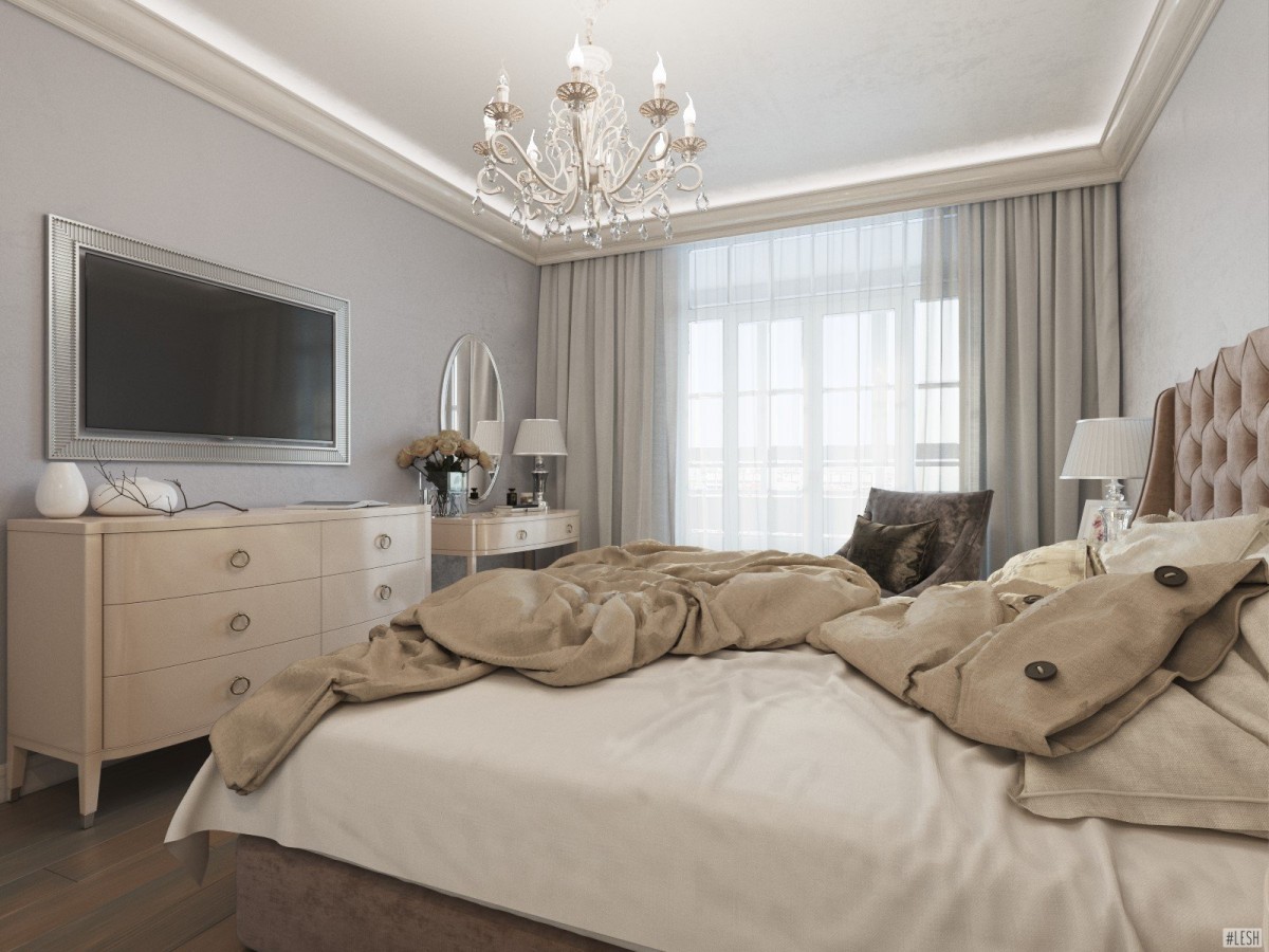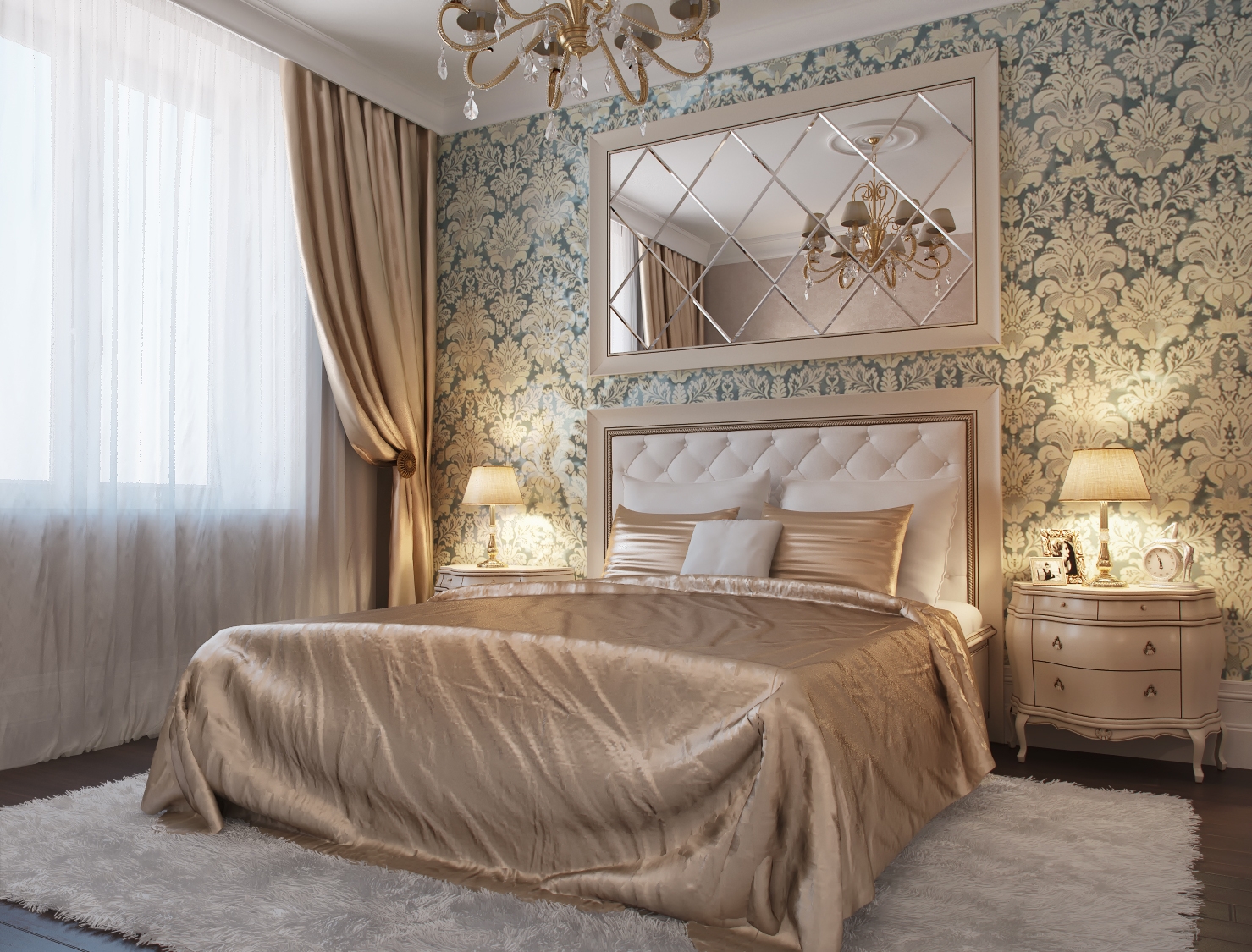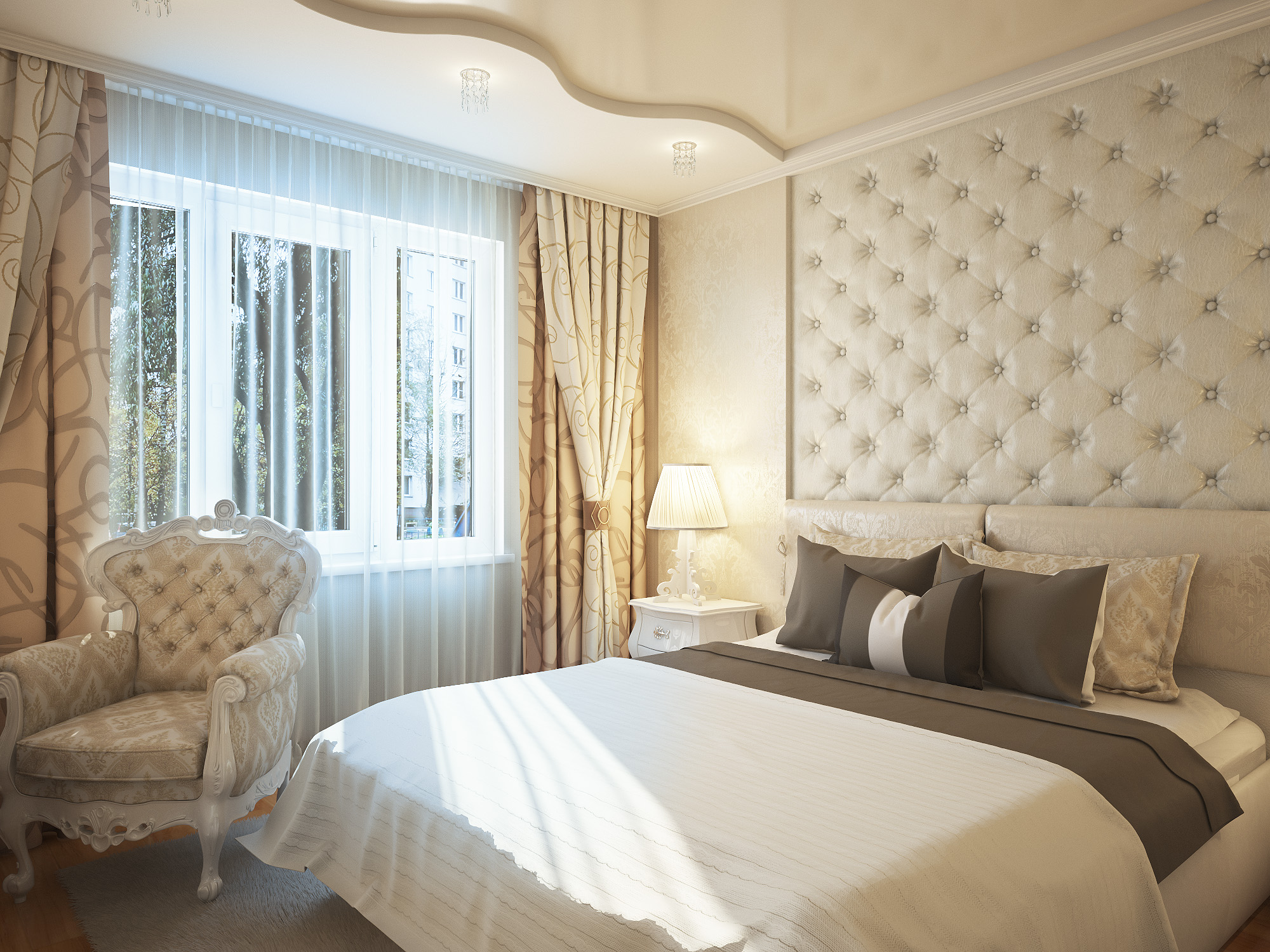 Спалня в класически стил. Може да забележите, че ремонтът на такава стая няма да е евтин, ако дадете предпочитание на този дизайн. Луксозното легло, фотьойл и завеси не могат да не се нарекат ярки акценти в стаята.