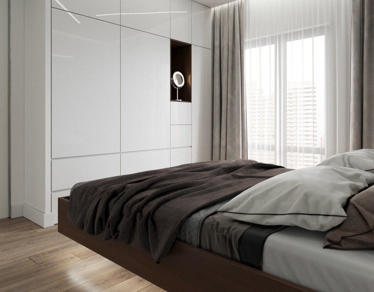 Минималистичната светла спалня привлича вниманието със своята спретнатост. В същото време дизайнерите направиха стаята възможно най -функционална, осигурявайки място за съхранение не само в скрина и гардероба, което не се вижда на снимката, но и в леглото.
