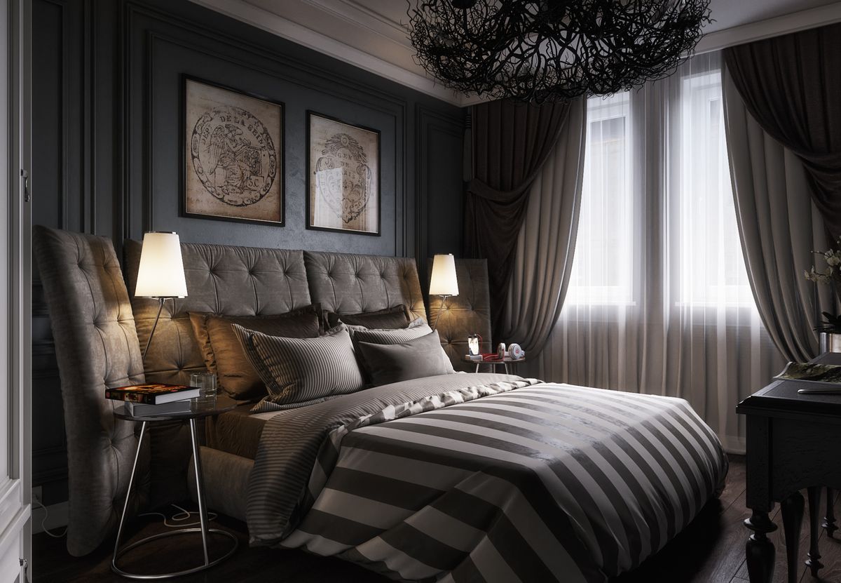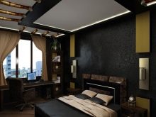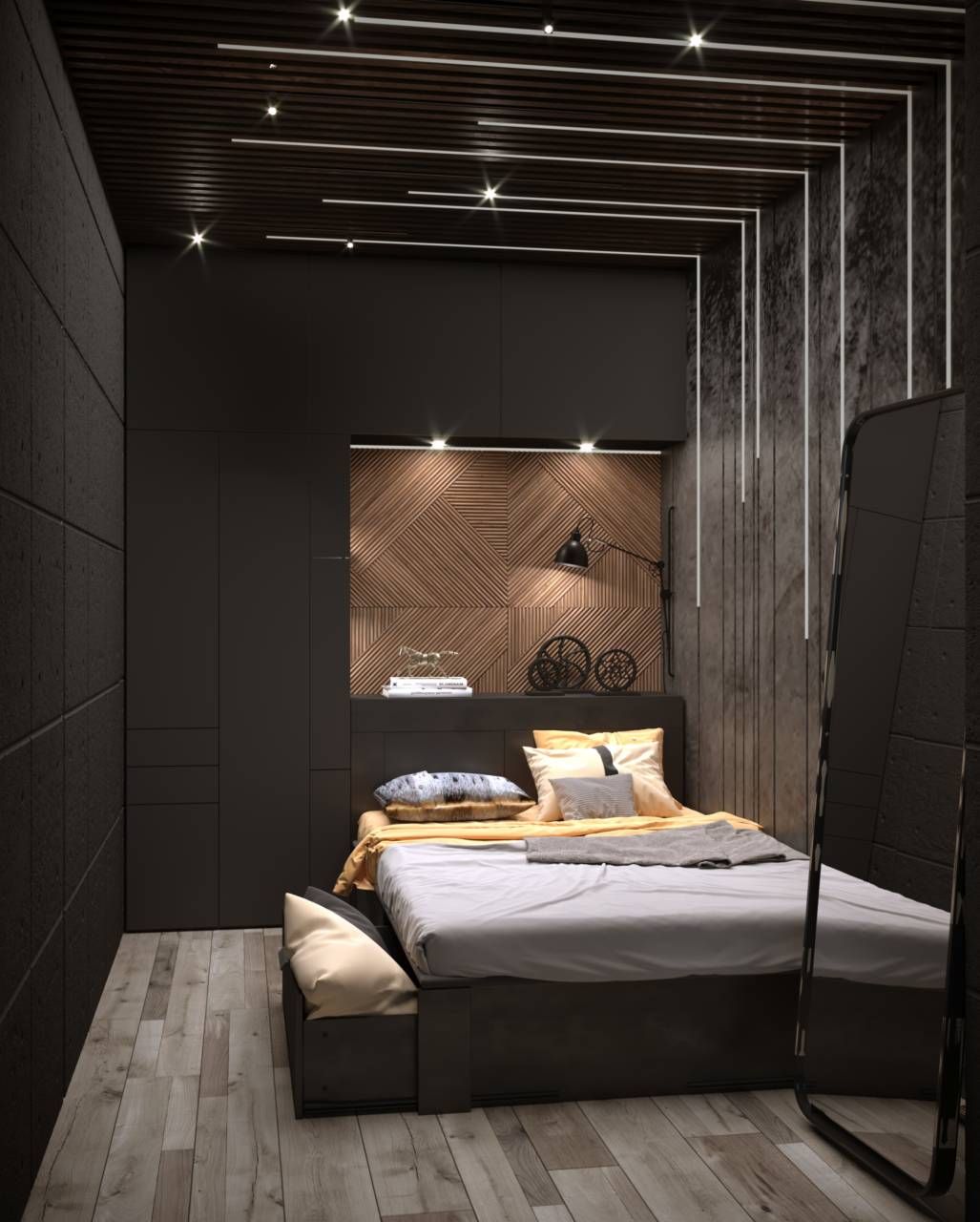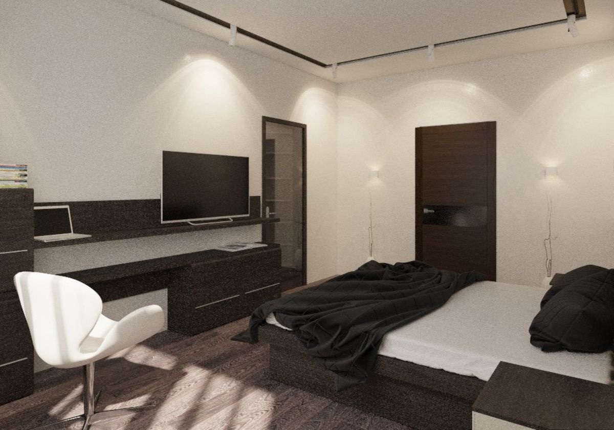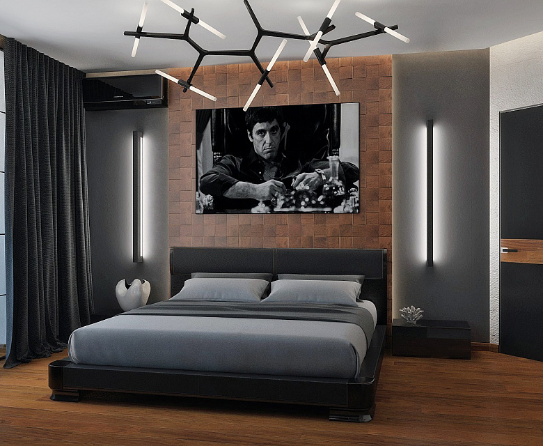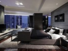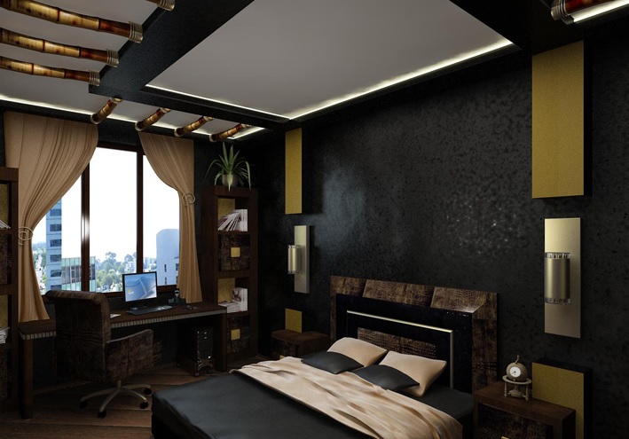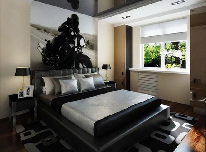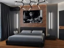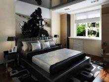 Дизайнът на спалнята на представителя на силния пол не приема голите и розови нюанси и пъстрота, характерни за пространствата на деца и млади момичета. Мъжката палитра се отличава със сбитост, сдържаност и доминиране на тъмните тонове. Въпреки това мащабът трябва да предизвиква само положителни емоции.
