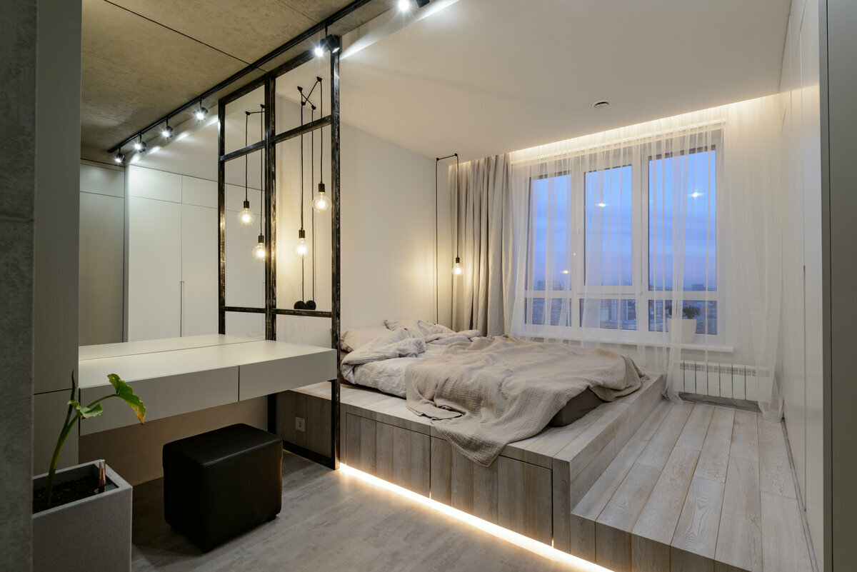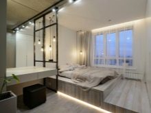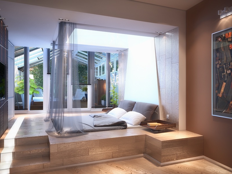 Зоната за отдих, подредена близо до прозореца, изглежда много стилно, когато леглото на подиума плавно "се влива" в перваза на прозореца. Това решение ще комбинира легла и възможности за отдих. Между тази зона и останалата част от пространството е инсталиран лек сгъваем екран или стелаж.