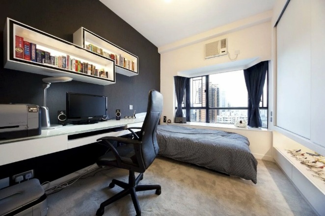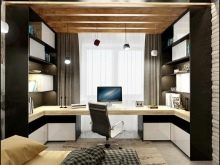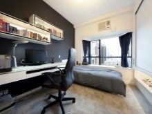 Ако мъж учи или често ходи на работа вкъщи, тогава отделно място в спалнята трябва да бъде отделено за работната зона. Там са поставени компютри и рафтове. В този случай е желателно тази зона да се отдели от останалото пространство с багажник.