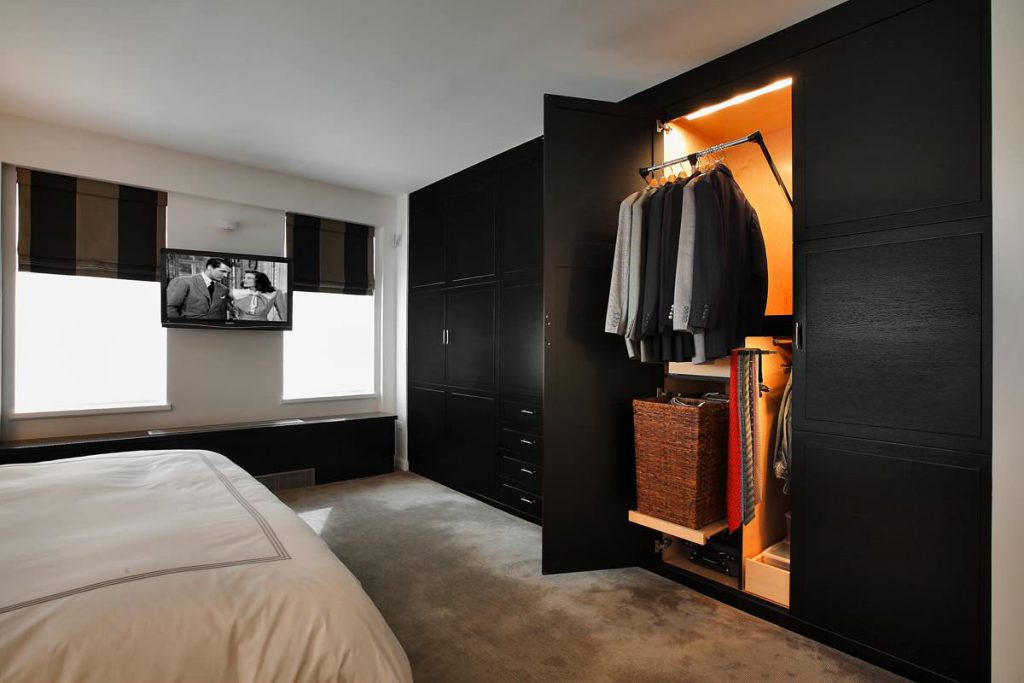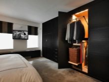 За съблекалня в мъжкия блок можете да разпределите място под стълбите или в ниша. Ергономично решение би било да съхранявате обувки, дрехи и спортни аксесоари на лоджията или на изолирания балкон. И разбира се, стаята на представител на силния пол ще бъде недовършена без килер - желателно е тя да е просторна. В голяма стая моделите купе изглеждат ефектно; в малка стая е по -добре да се даде предпочитание на няколко моливи, монтирани в ъглите. За приспособяване на дреболии са подходящи нощни шкафчета.