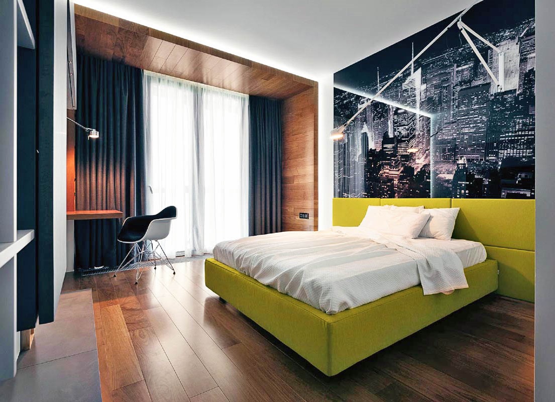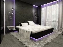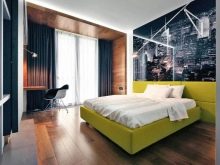 Леглото в такава спалня трябва да бъде лаконично, но в същото време не аскетично. Тук ще бъдат подходящи просторни модули за съхранение - те често се отварят. Плакати, фототапети с изглед към града и графити са избрани като елементи за декор.