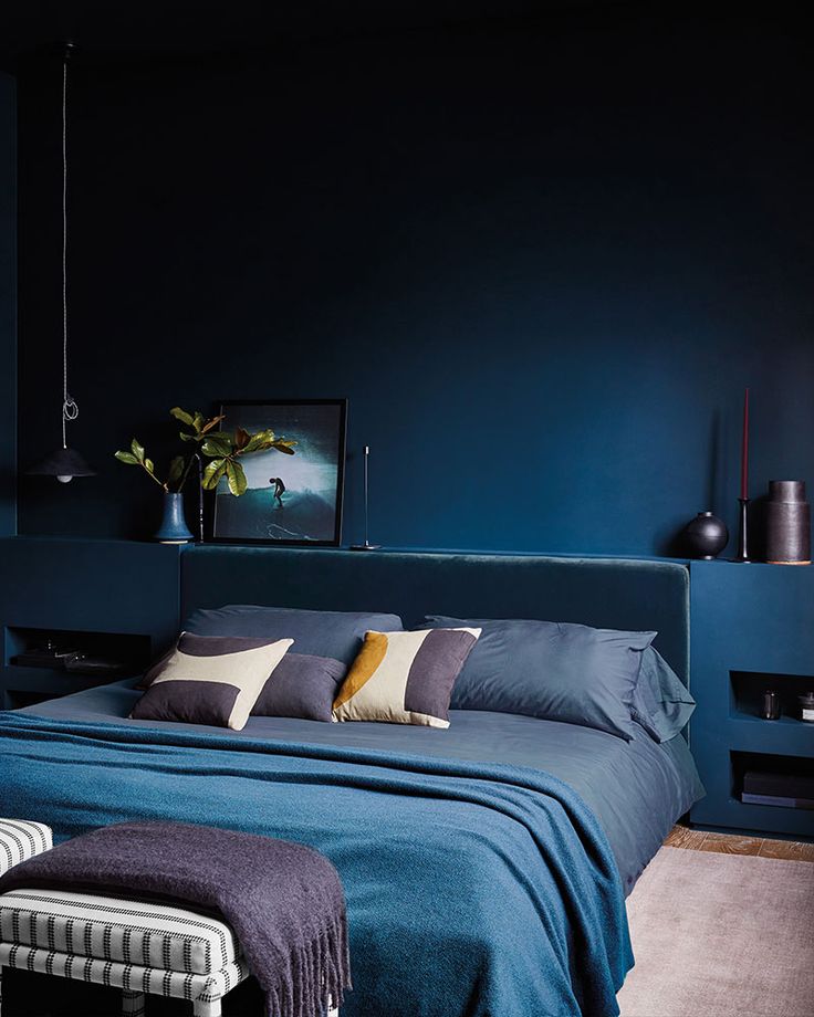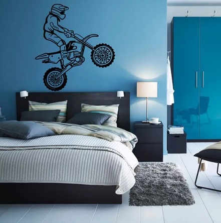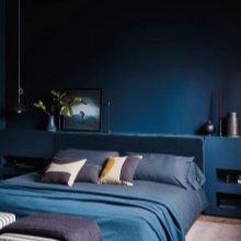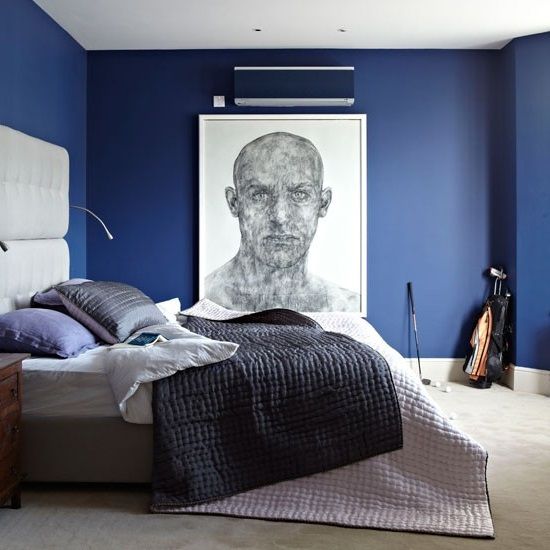 В пространството на млад мъж синята палитра ще изглежда добре. Богатата гама от нюанси е подчертана с различни нюанси, вариращи от светло синьо до заглушено индиго. Тандемът от богат ултрамарин и дънки се възприема свеж. От тъмните варианти е по -добре да се даде предпочитание на здрача, цвета на бурното небе и кобалта.