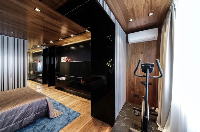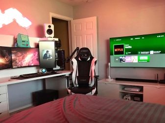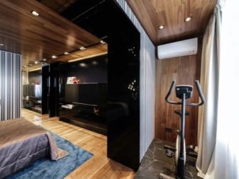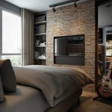 В дизайна на мъжката спалня, особено на млад мъж, е наложително да се въведе пространство за свободното време. Това може да бъде място за хоризонтална лента или игрална конзола. Телевизионният панел трябва да бъде фиксиран към една от стените. Ако стаята е двуетажна, тогава горният етаж може да се приеме като хоби.