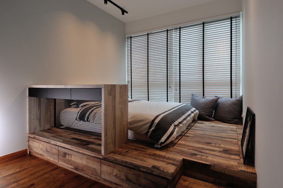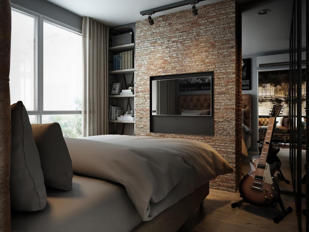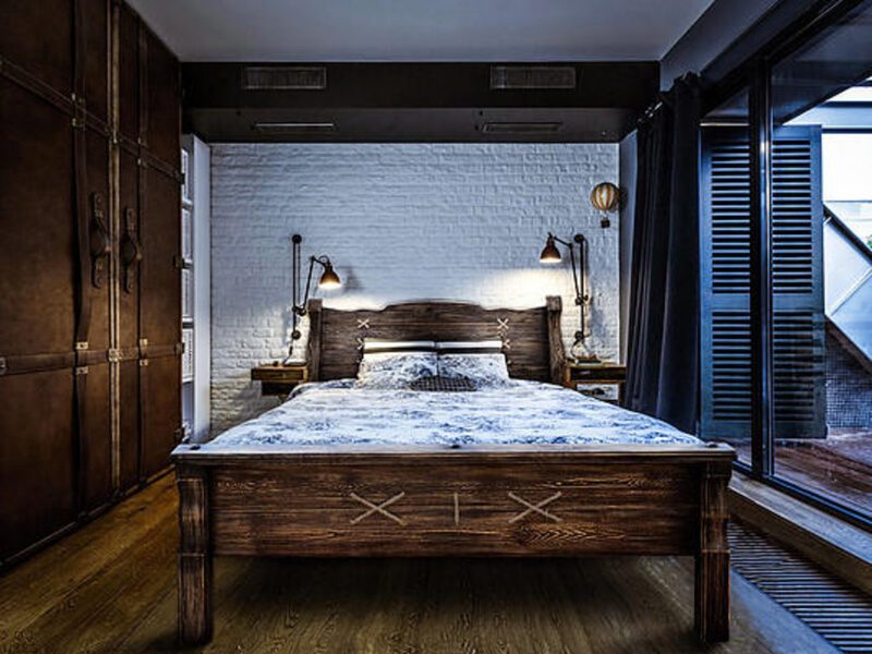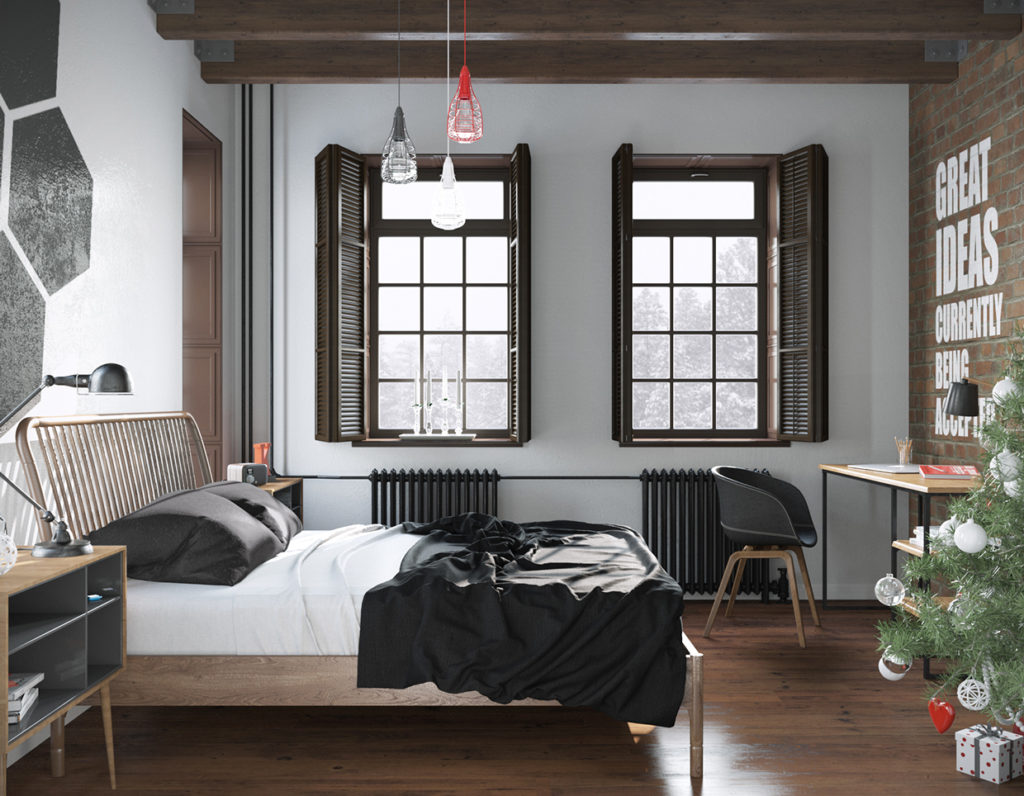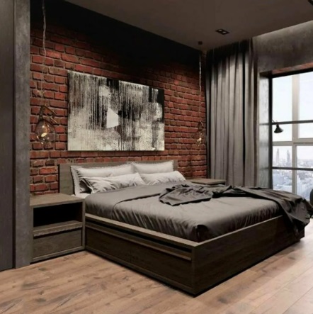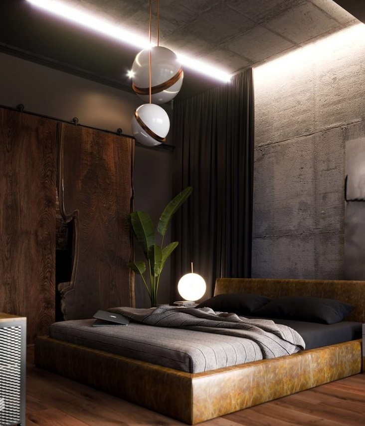 Младите мъже могат да проектират спалнята си като таванско помещение. Характеризира се с изобилие от незаето пространство и сурови текстури от бетон или тухла. Отворените инженерни комуникации се превръщат в задължителен атрибут на този стил. Тук не е обичайно да се крият тръби, електрически проводници и таванни греди.