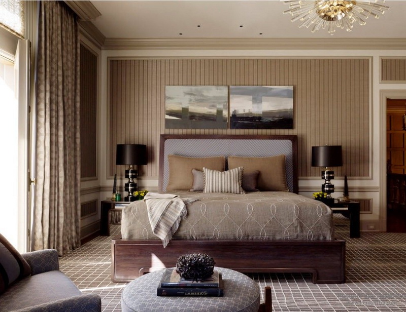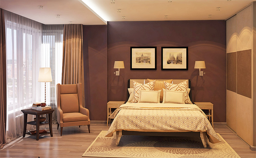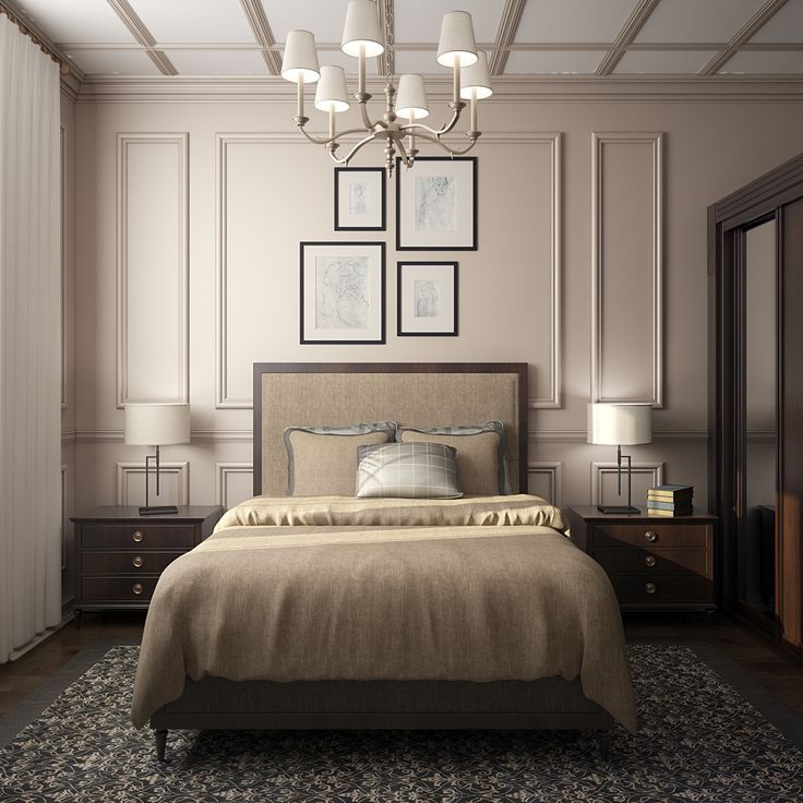 Ако апартаментът е декориран в класически традиции, тогава спалнята трябва да бъде завършена в същия стил. Такива стаи са представени в пастелни цветове, които се допълват от симетрията на декора. Мазилките в комбинация с най-новите модели домакински уреди изглеждат добре тук, дърво и висококачествен текстил са приемливи. Приглушеното осветление допълва цялата картина.