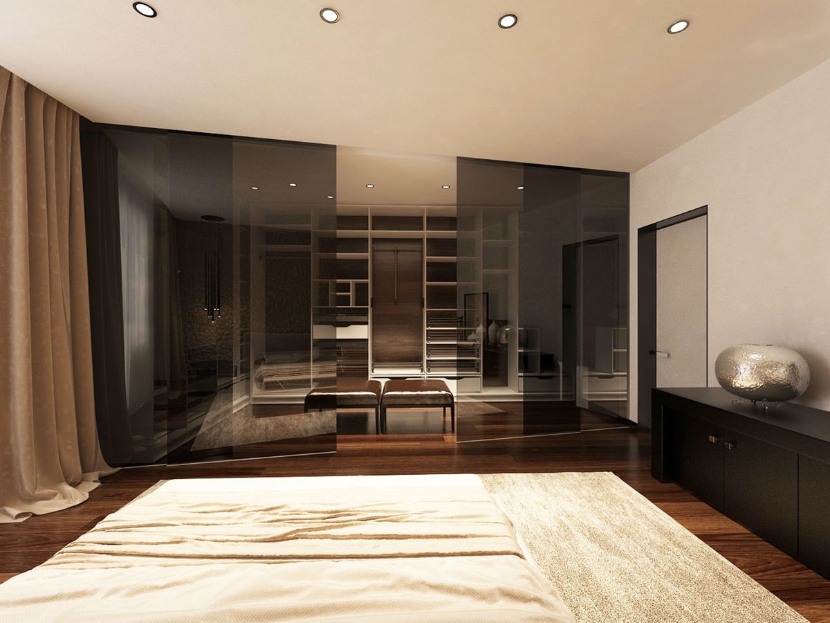 Стъклото се използва за подчертаване на бруталността на собственика на стаята. Това могат да бъдат прегради между функционални зони, полупрозрачните вложки на вратите изглеждат добре - подчертават отворения дух на мъж. Панорамните прозорци без драперии ще бъдат идеален вариант за мъжка спалня. Ако това не е технически възможно, тогава изборът трябва да се направи в полза на дискретни щори.