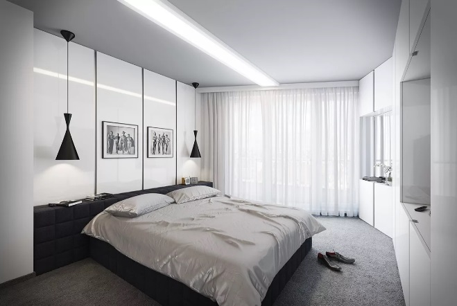 Минимализмът предполага изобилие от светлина, пространство, минимум обзавеждане и единичен или напълно отсъстващ декор. Мъжката спалня е с изключително необходимо обзавеждане, няма място за излишни предмети. Компактен модул за съхранение, ергономична работна зона, легло и стенни свещи - това е всичко, от което човек се нуждае, за да се чувства максимално комфортно.