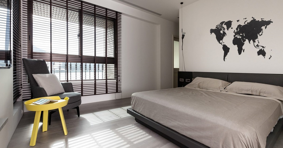 Ако стаята е декорирана в минималистичен стил, тогава е по -добре да се даде предпочитание на неутрални цветове. Така че, за декорация на спални, разположени от южната и източната страна, светло сив или студено бял цвят ще бъде добър избор. От северната страна, където естествената светлина е минимална, трябва да се предпочита топло бежово. Дървените цветове се допускат само като акценти.