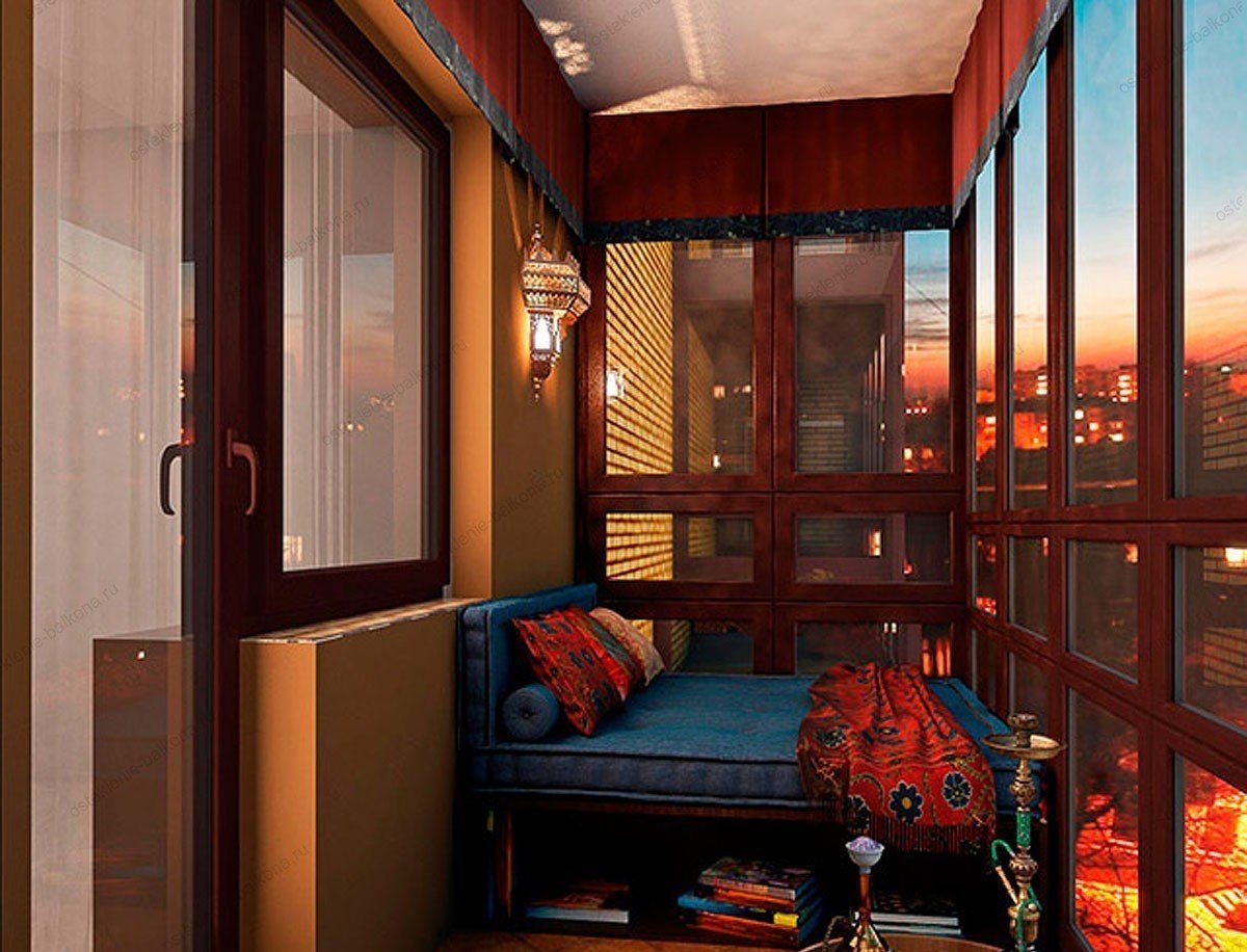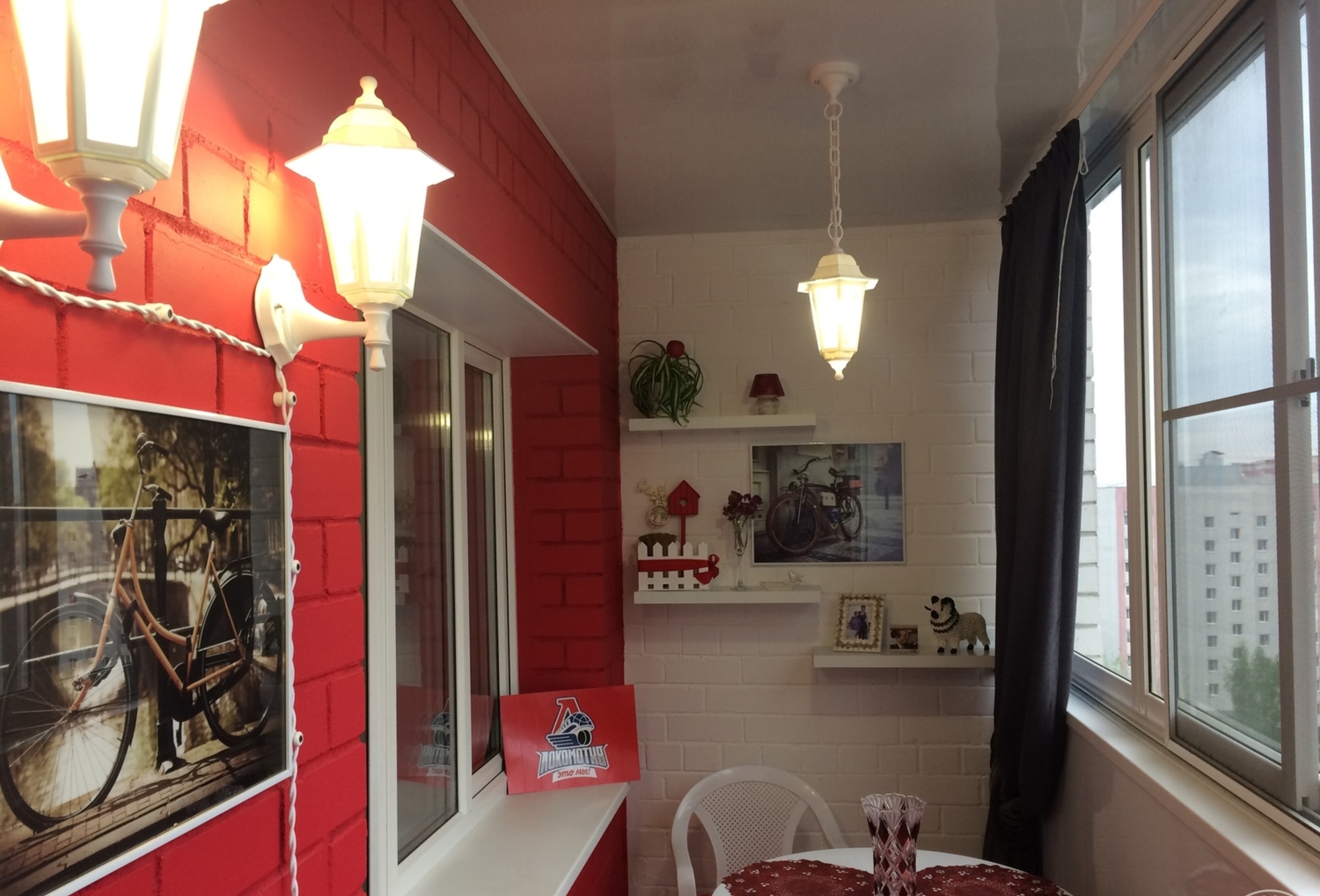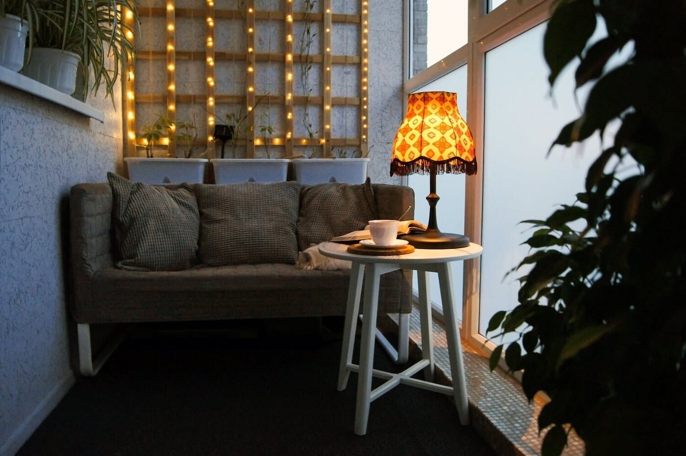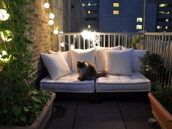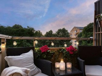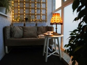 - Осветлението създава настроение, създава атмосфера, която допринася за появата на зони за отдих и отдих на балкона.