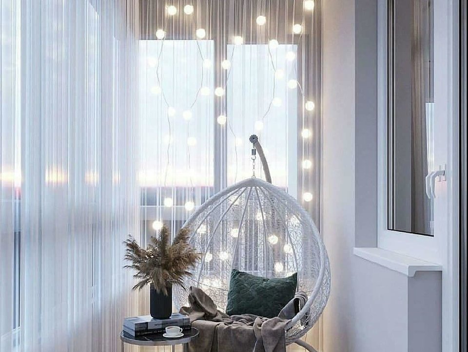 - И ако на балкона или лоджията виси огледало, ще бъде красиво да го украсите с едноцветен гирлянд. Това веднага прави стаята по -удобна, интимна и топла.
