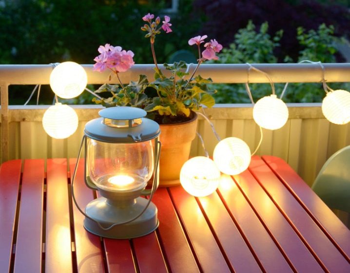 Ако балконът е отворен, осветлението също е необходимо вечер, но проблемът може да бъде затворен чрез закупуване на градински лампи, улични лампи, гирлянди и т.н.