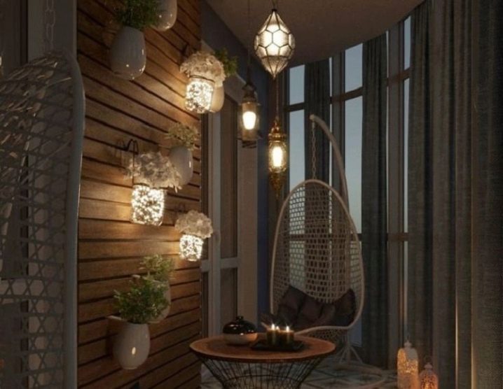 - в допълнение към висящите полилеи, в стенни вази се използва лек гирлянд, захранван от батерии, което силно влияе върху вечерното възприятие на стаята, изпълва лоджията с магия;