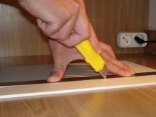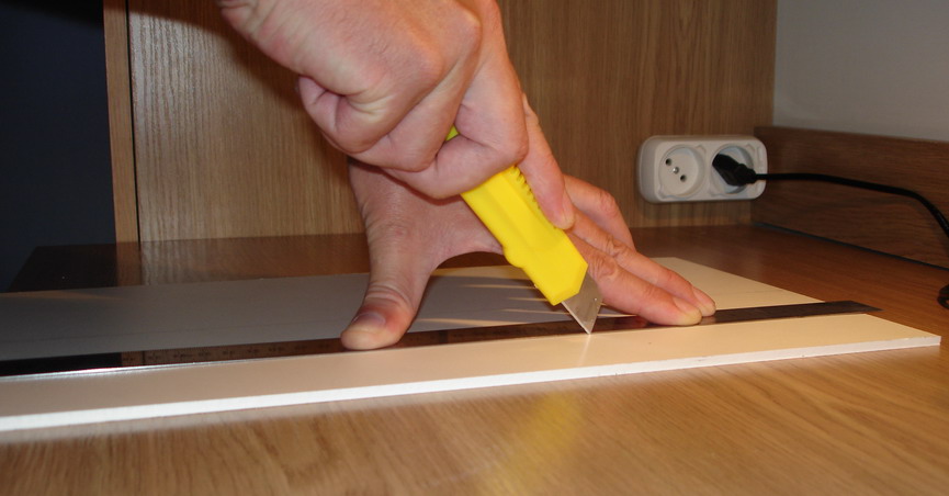 - след това изрежете лента от ъгли, продавани в комплект с MDF плочи (важно е вертикалните и хоризонталните ъгли да се допират точно, за това краищата им се изрязват под ъгъл от 45 градуса);