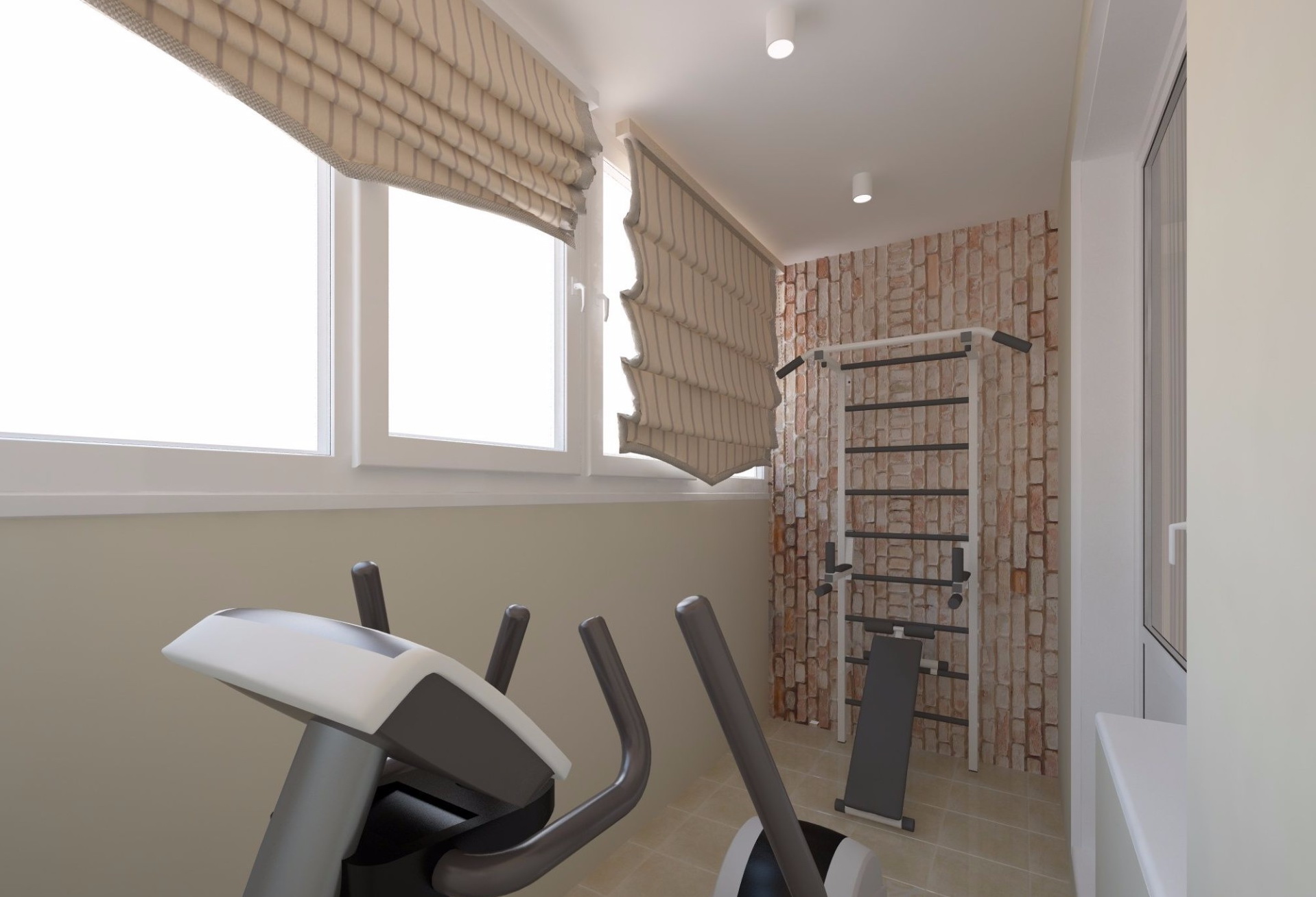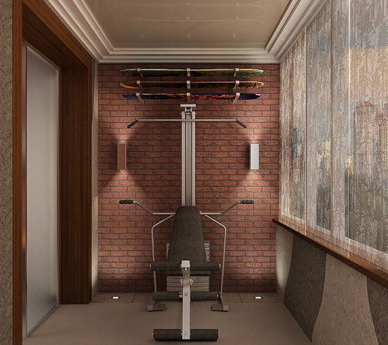 - Осветително устройство. За фитнес зала на балкона е подходящо само осветление отгоре. Лампите трябва да са бели, за да приличат на естествената дневна светлина.
