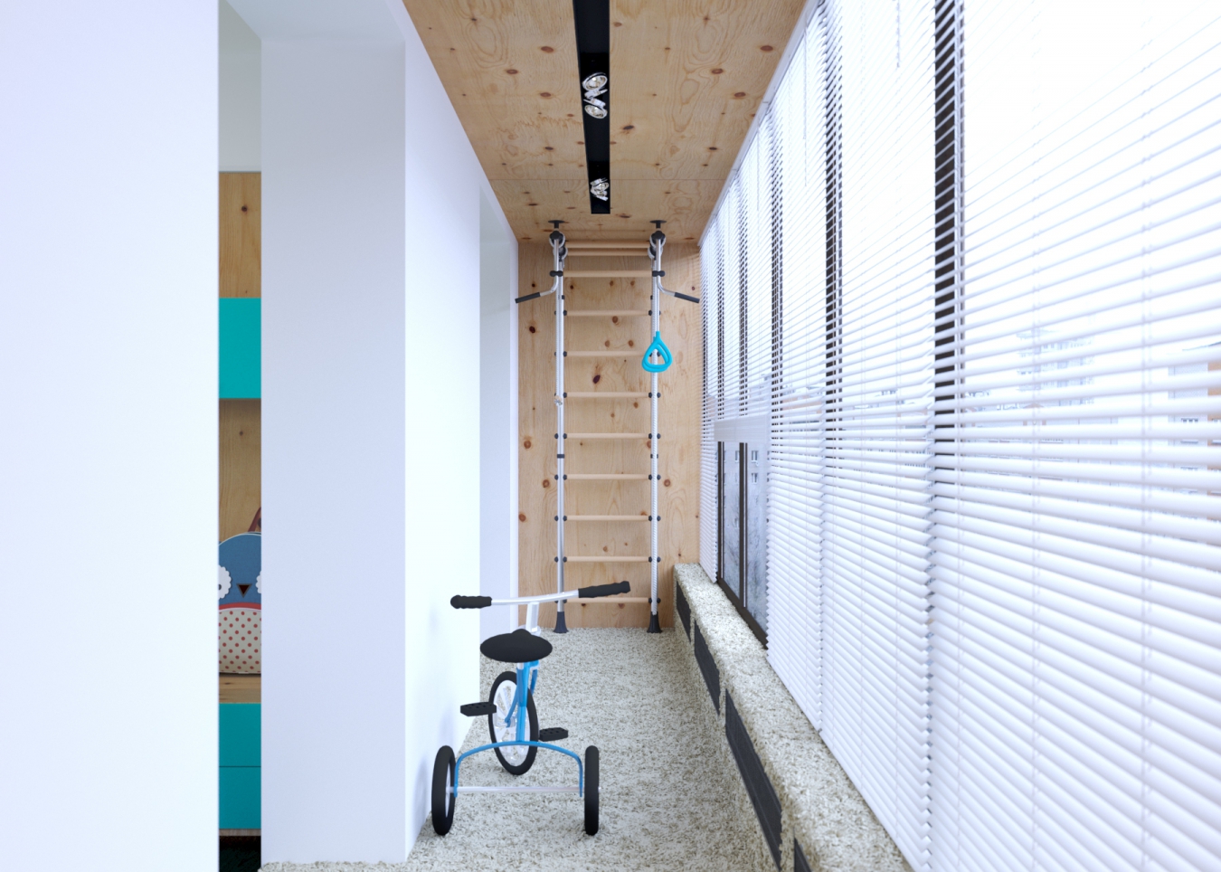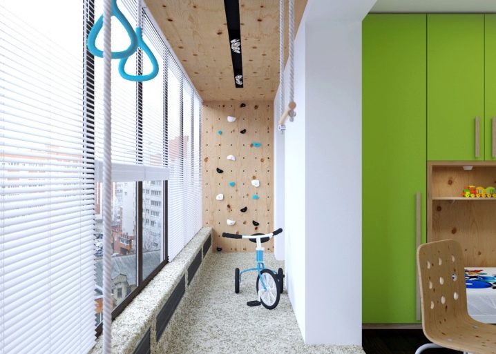 Това ще бъде достатъчно за детето за отлично настроение и физическо здраве. Ярък пример е преустроеният балкон на снимката, където за детето е предвидена стена за катерене.