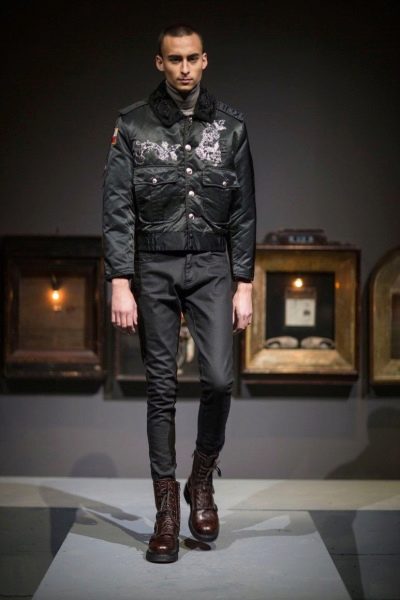 Пушена сива водолазка с високо гърло добавя нотка на практичност към този типичен градски вид. Спокойствието на тъмните нюанси се разрежда тук от сребристата бродерия, която украсява игото на якето.