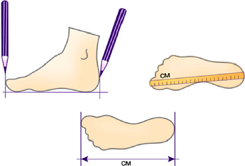 Дължината на стъпалото се измерва много просто - за това трябва да поставите крака върху лист хартия, да го кръгнете с маркер и след това да измерите от петата до големия пръст.
