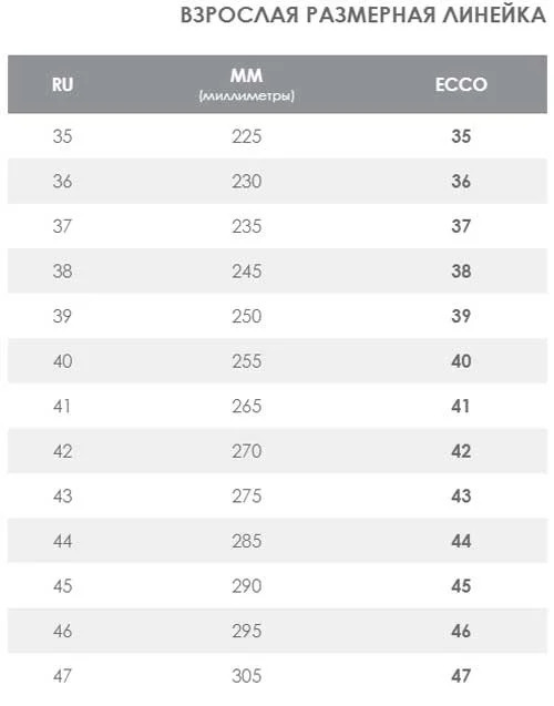 Знаейки размера на стелката, можете да изберете правилния размер. В големите търговски центрове се продават обувки ECCO, където можете да опитате. Ако ви е трудно да изберете в сайта, можете да се свържете с консултантите - те ще ви помогнат да изберете правилния размер. Трябва да се има предвид, че цифрата в таблицата не е размерът на стелката, която се различава от размерите на масата с 5 мм нагоре.