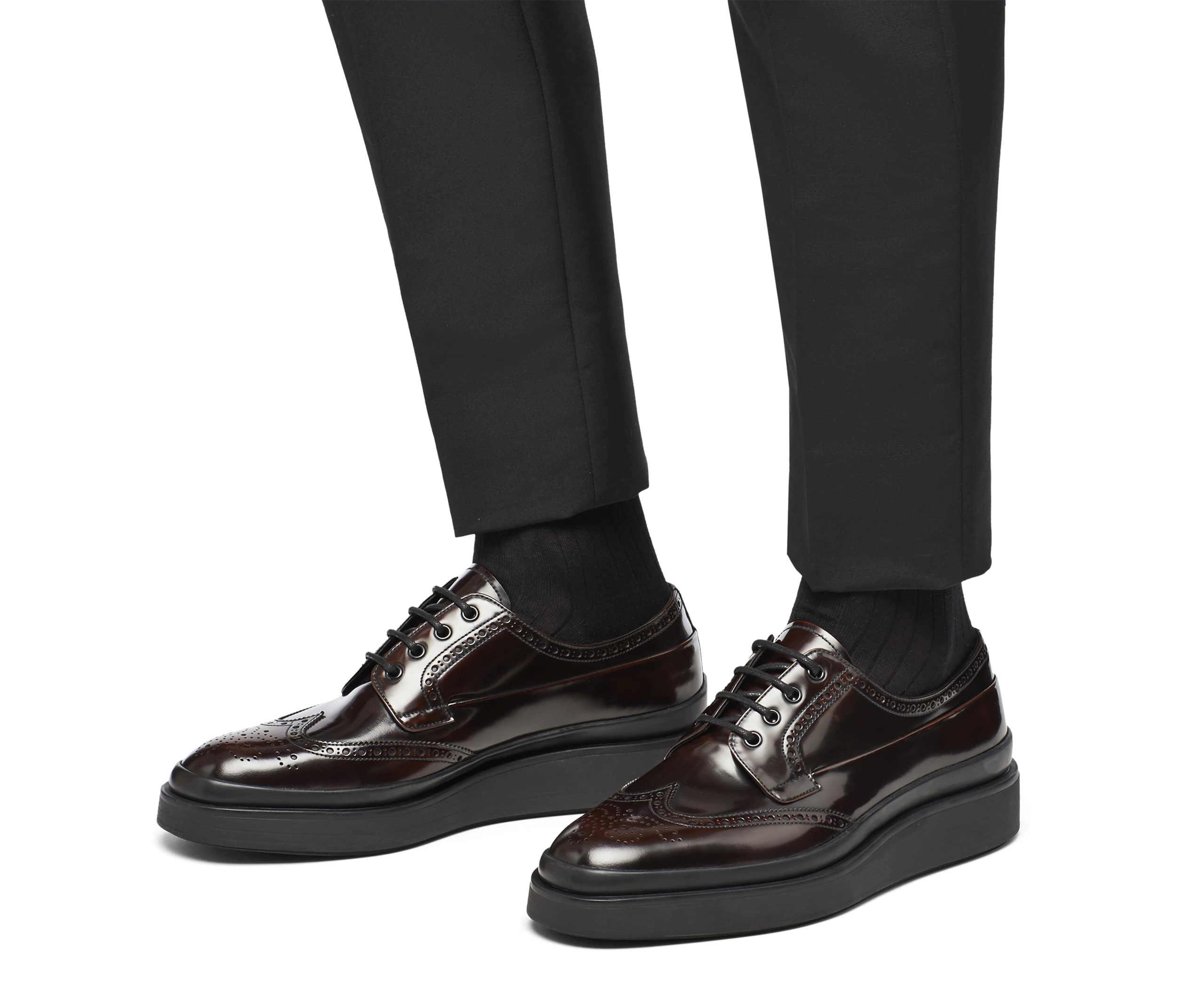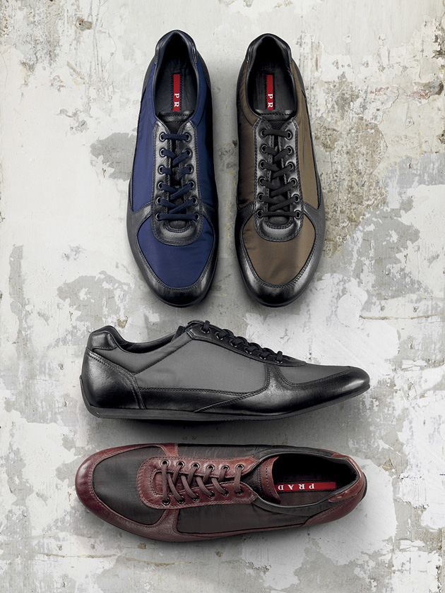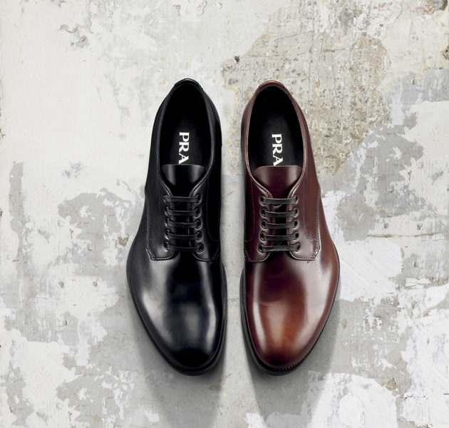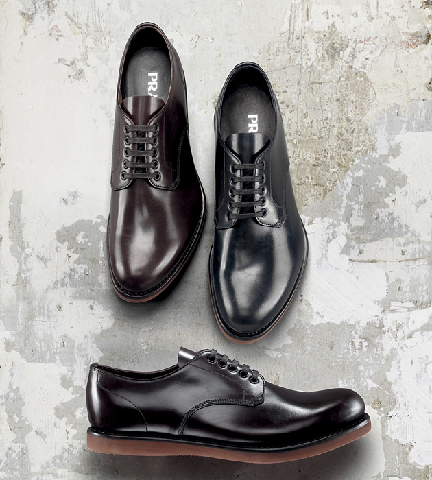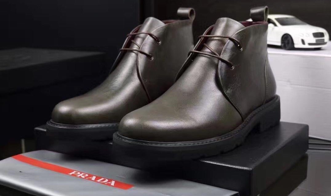 Мъжете в обувки Prada са уверени и в крак с времето. Асортиментът на марката включва както елегантни класически, така и неформални модели. Модни брутални елементи се използват под формата на масивна подметка и метални части, комбинация от различни материали и текстури. Има спортна линия и модели със смесен дизайн, които съчетават характеристиките на маратонки и традиционни ботуши.