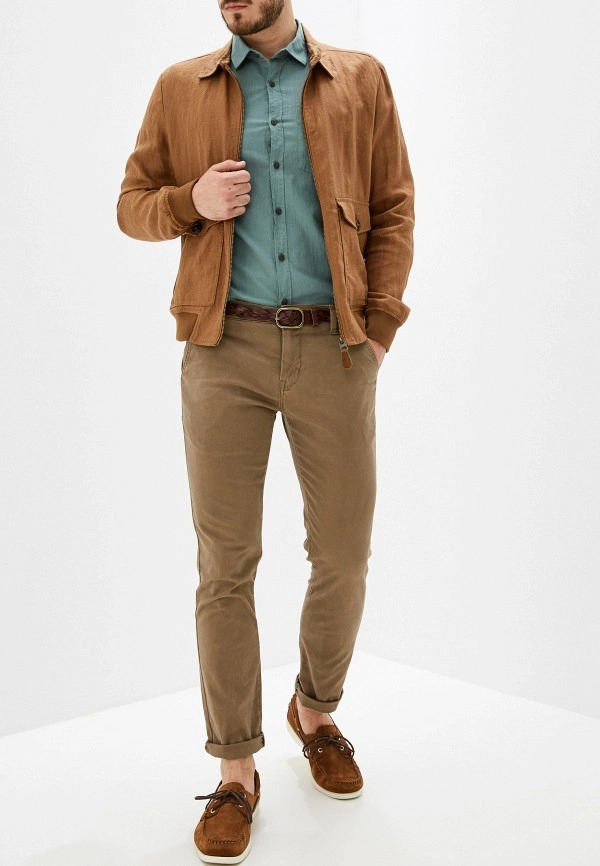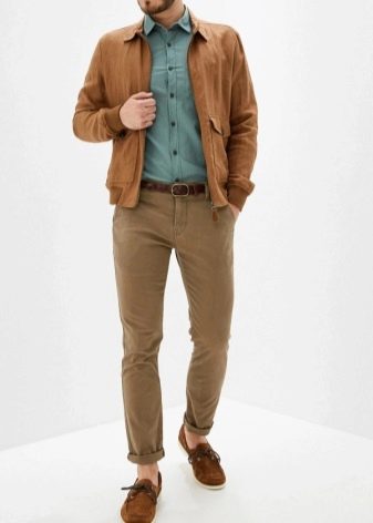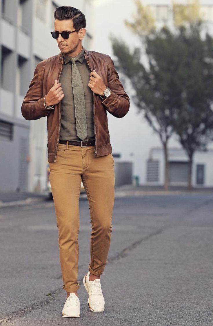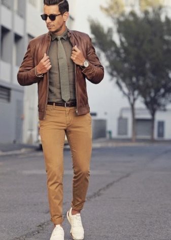 - кафяво яке (бомбардировач) от естествена кожа, стилна риза, бежови панталони и слънчеви очила;