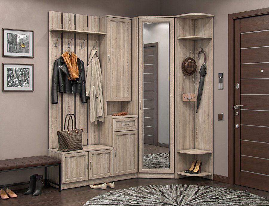 Мебелите могат да бъдат масивни, модулни, композитни. Вариантите от първия тип имат обща рамка. Аналозите от модулен тип се състоят от няколко блока с еднаква ширина. Композитните коридори имат отделни единици (например висящо огледало, бордюр и тесен рафт).