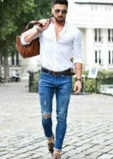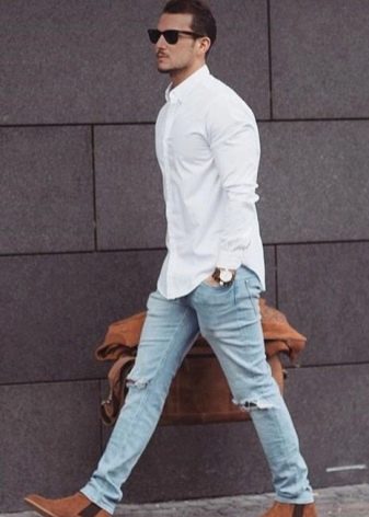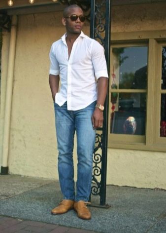 - Дънки. Използва се риза със спортна или класическа кройка. Дънките трябва да са от лен, памук или фланела. По-добре да останете на панталоните с класическа кройка със среден ръст. Разкъсаните съвременни модели също ще изглеждат добре.