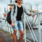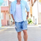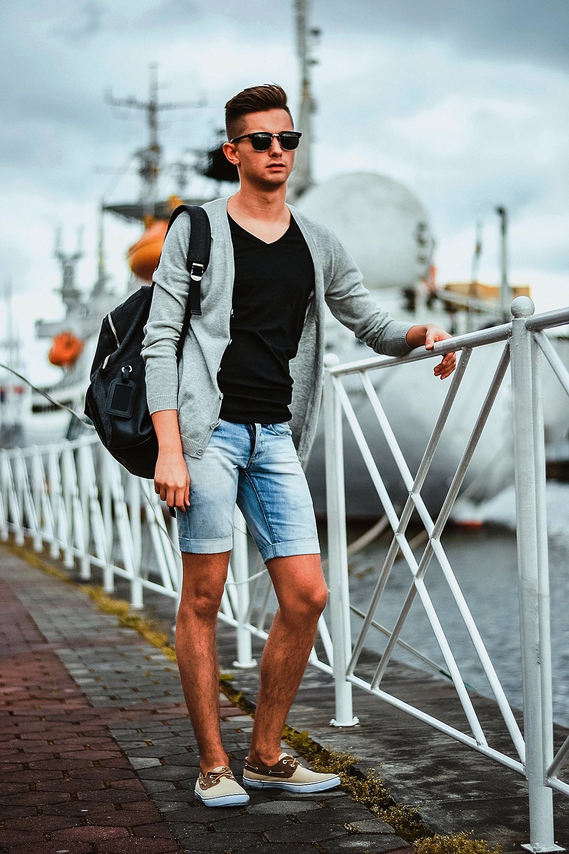 - Страхотно лято изображение в ежедневен стил. На снимката мъж в меки памучни шорти, непринудена риза и леки текстилни кецове.