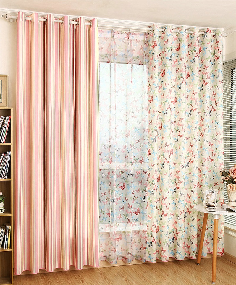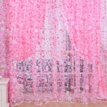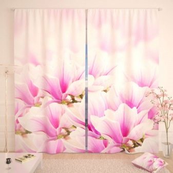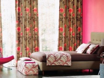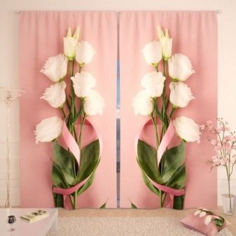 Ако говорим за щампи, тогава върху розовите завеси те могат да бъдат много различни. Така че най -често те изобразяват цветя (малки и големи), малък грах, пеперуди или растителни шарки. Вариантите за завеси с такъв модел са най -подходящи за интериора на спалнята - както за възрастни, така и за деца. Често в продажба можете да видите завеси в клетка или във вертикална лента - такива рисунки могат визуално да съживят интериора, да го направят по -необичаен.