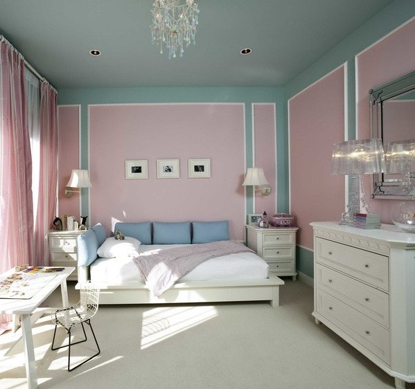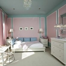 Друг вариант, който изглежда изгодно и хармонично, е светло розово и синьо. Тази комбинация от нюанси ще направи интериора по -деликатен, мек и дори ефирен. Тази комбинация ще изглежда особено добре в спални и детски стаи.