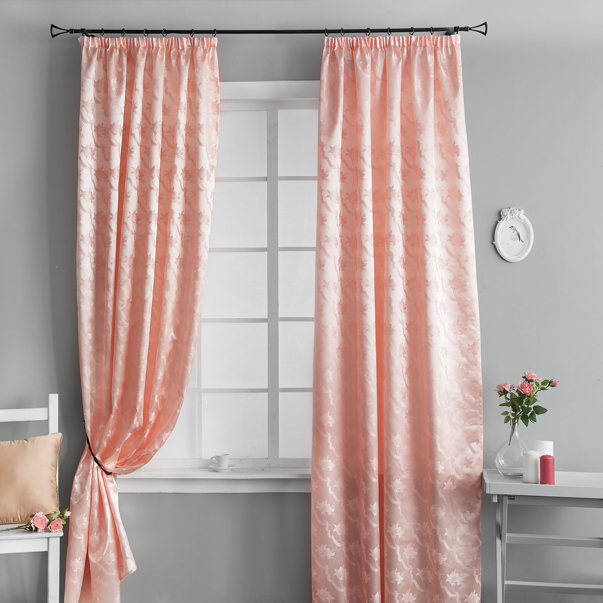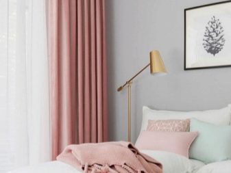 Пастелно розовите завеси също могат да допълнят интериора, доминиран от светло сиво. Това е класическа версия, която изглежда доста спокойна, хармонична и спокойна и затова тази комбинация може да се използва за спални.