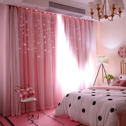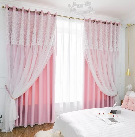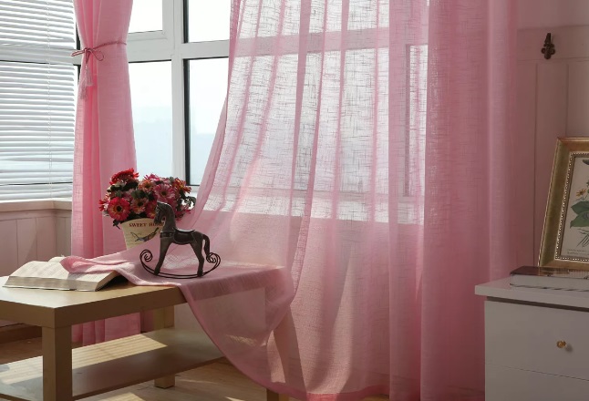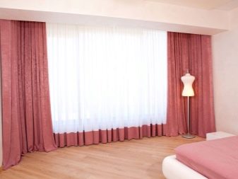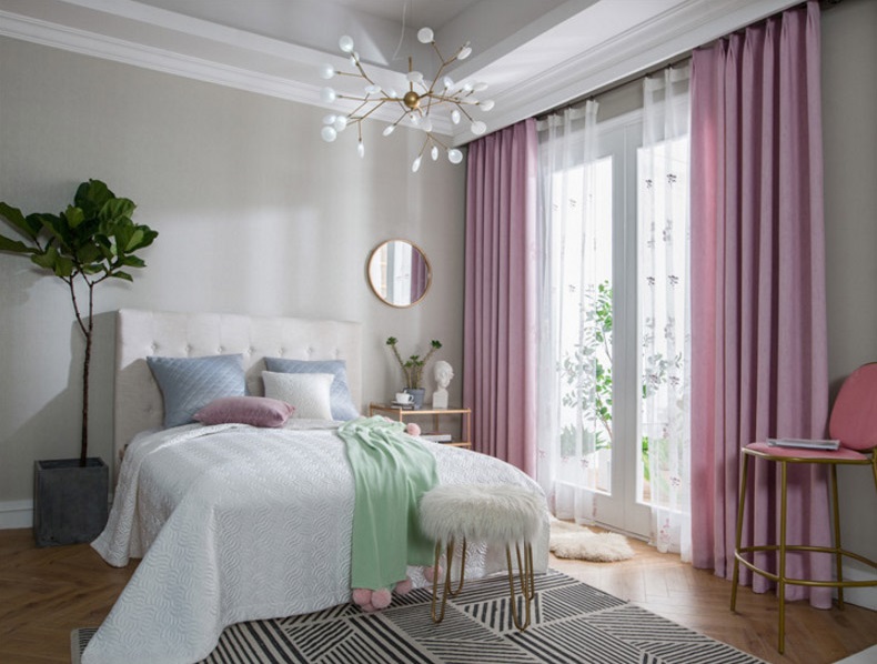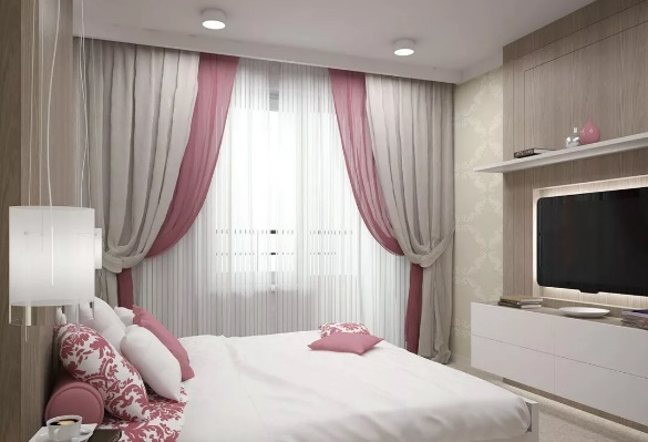 Розовите завеси ще изглеждат страхотно в спалнята, чийто интериор е декориран в светли цветове. Например, завеси от розов цвят без шарка, изработени от плътен материал, в такава стая ще се хармонизират добре с тюл в бяло или друг светъл цвят.