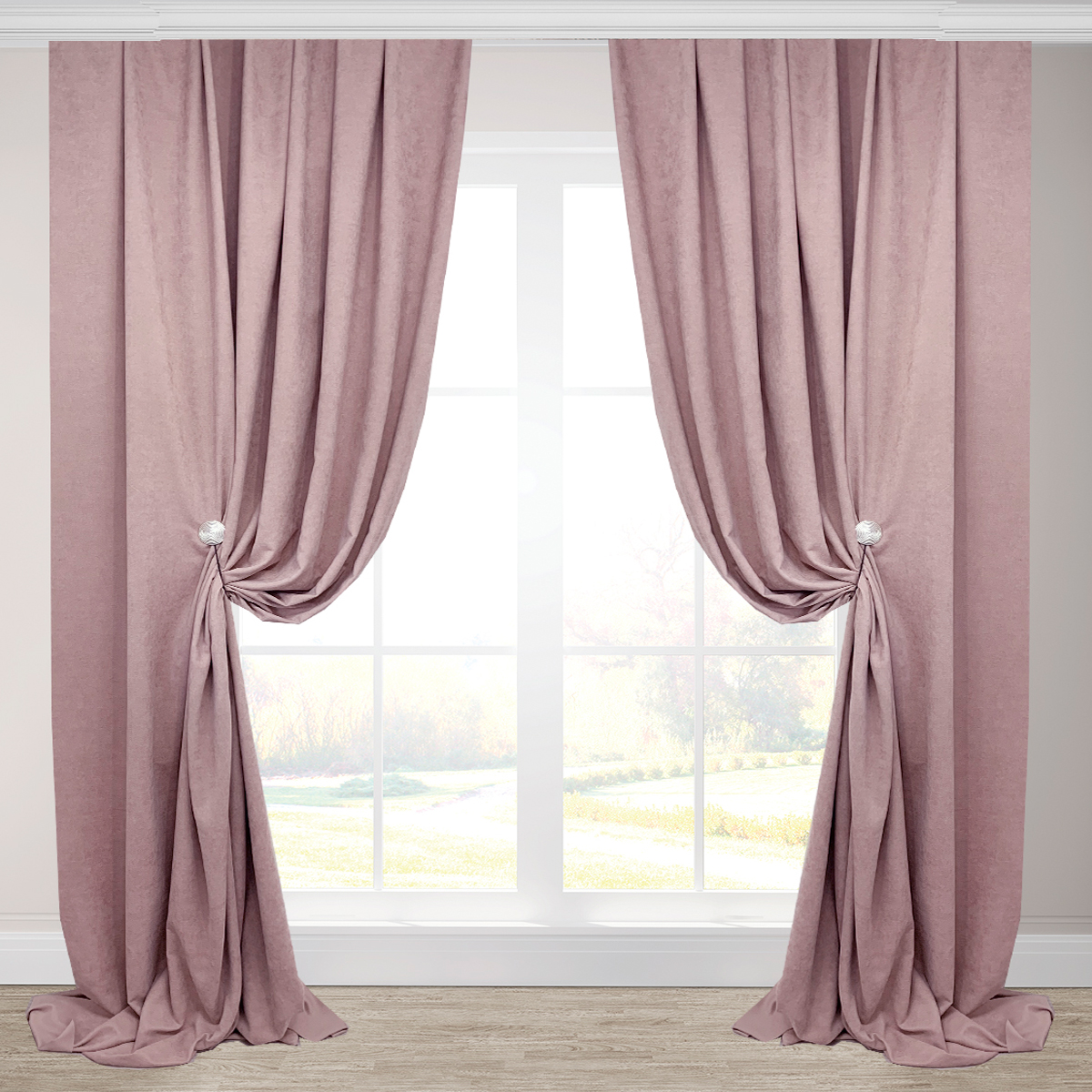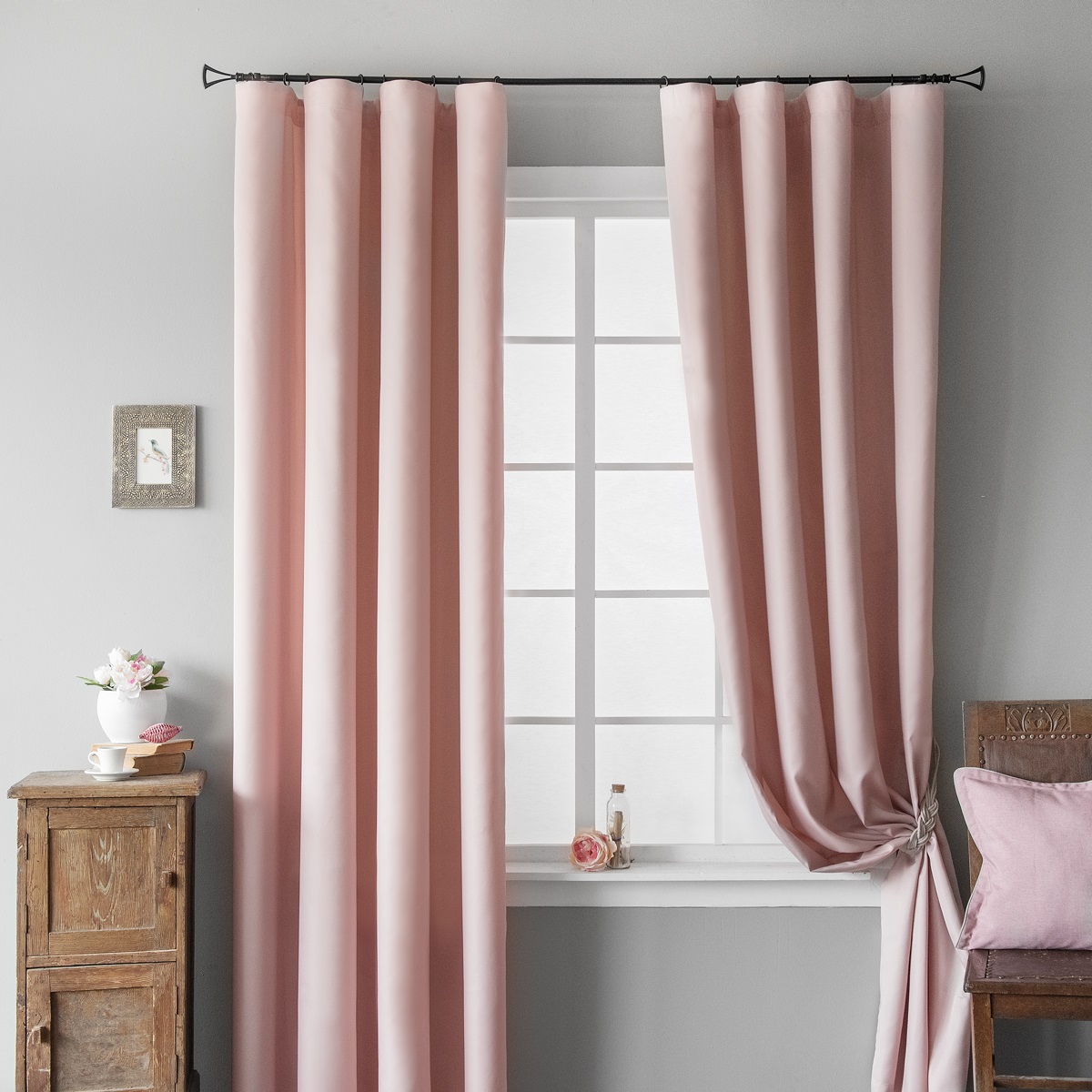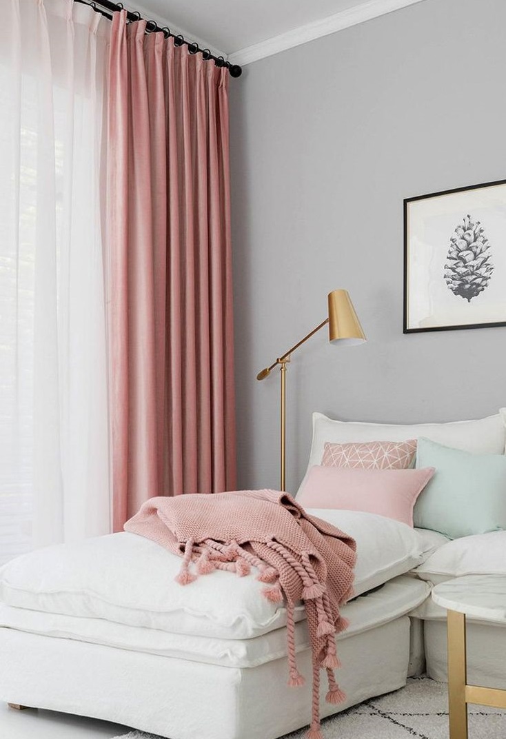 Светло розови или прахообразни завеси, изработени от плътен материал, ще се впишат добре в спалня, доминирана от различни нюанси на сивото.