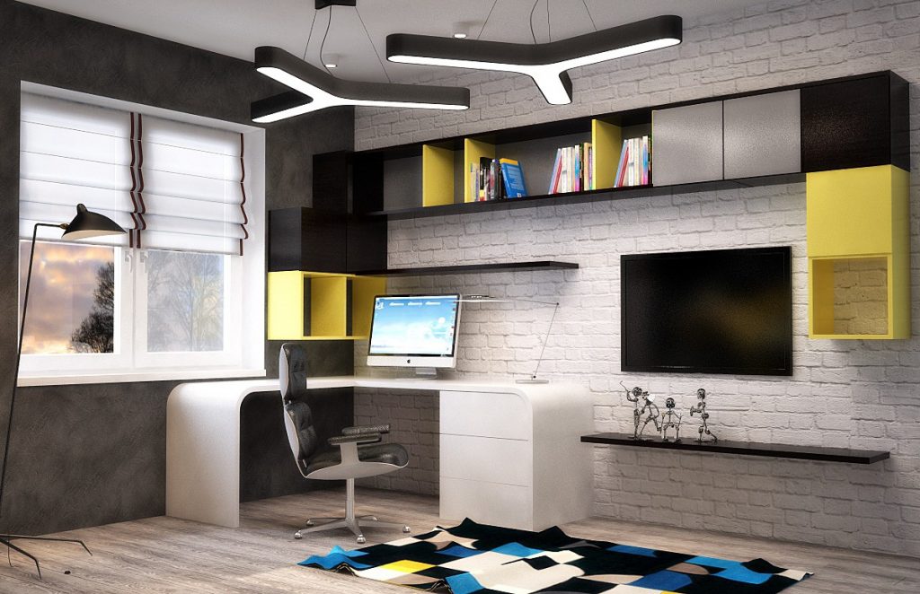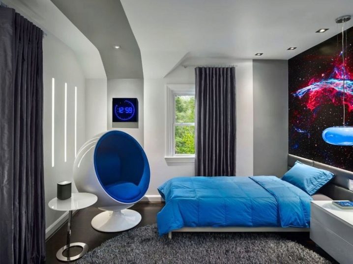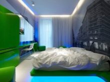 Не е толкова лесно да се проектира високотехнологична тийнейджърска спалня. В този случай си струва да използвате контрастни цветове - сиво заедно с жълто или зеленикаво. Ако в стаята има телевизор, той трябва да бъде поставен на стената. Рафтовете за книги, ако има такива, трябва да бъдат с необичайна форма, за да привлекат допълнително внимание.