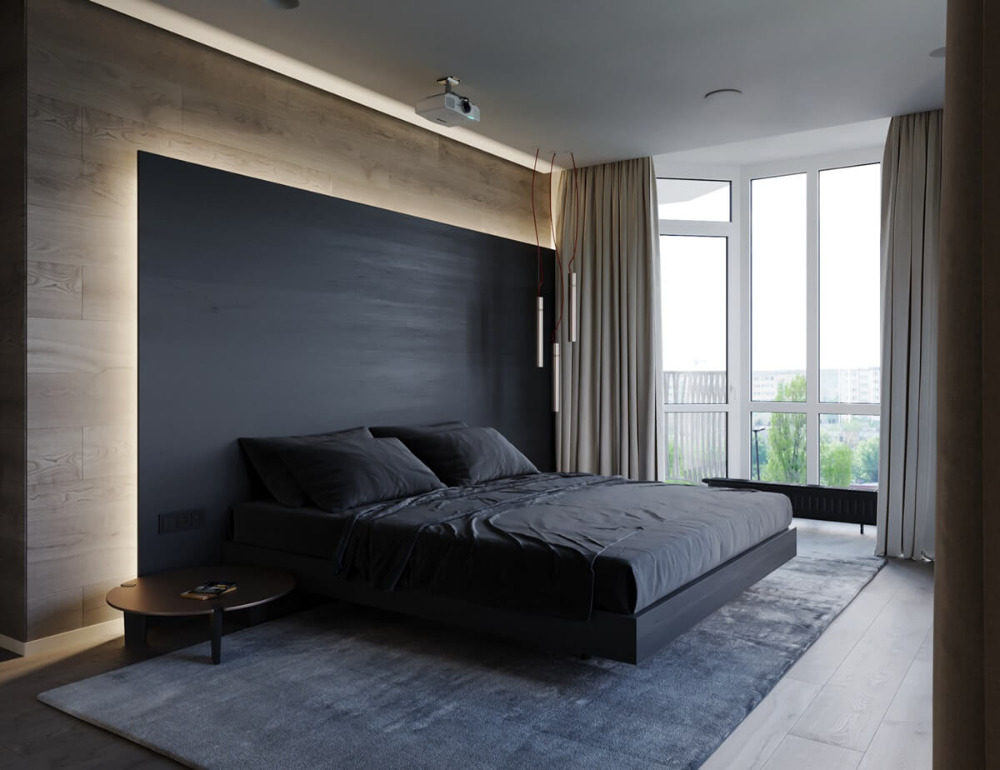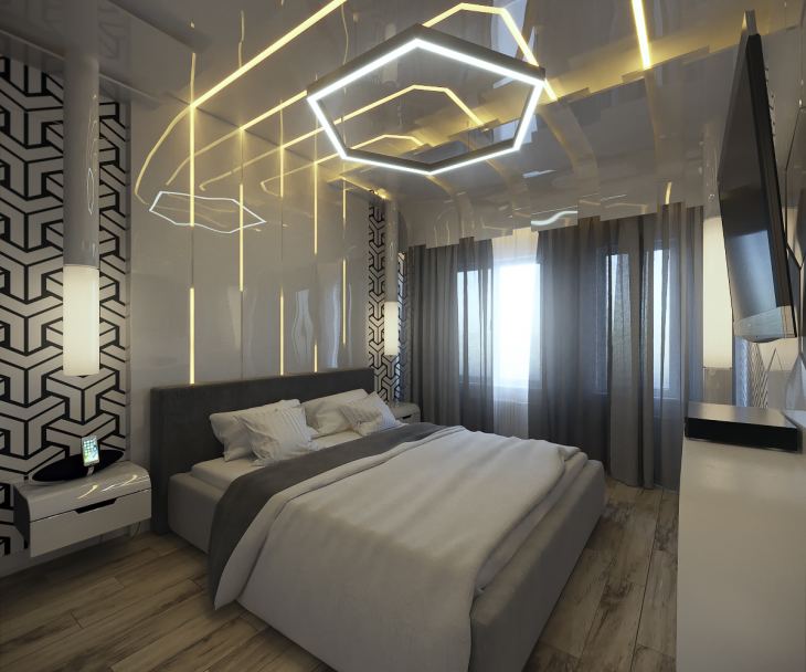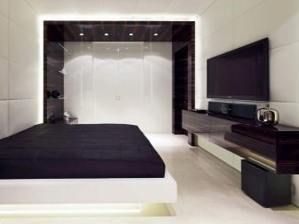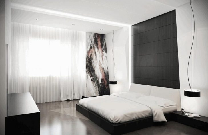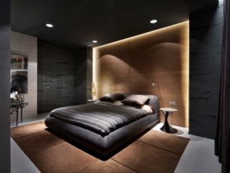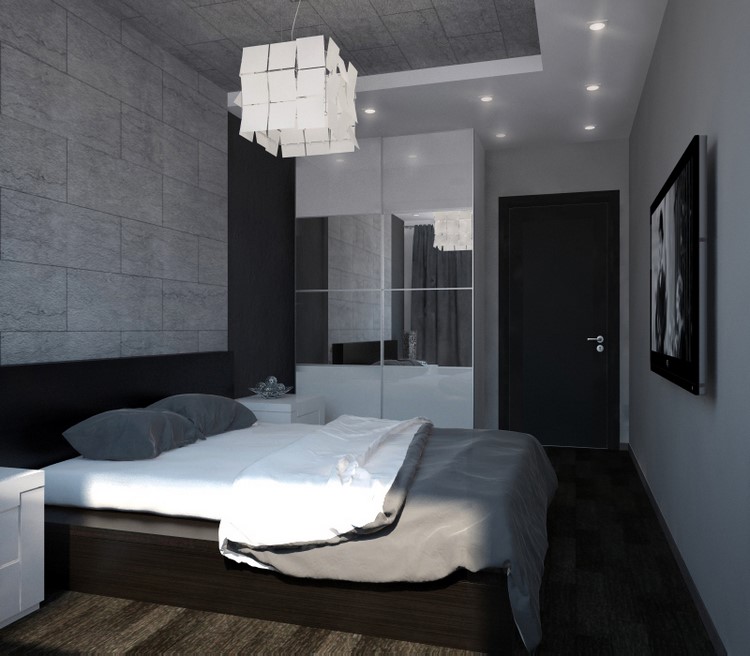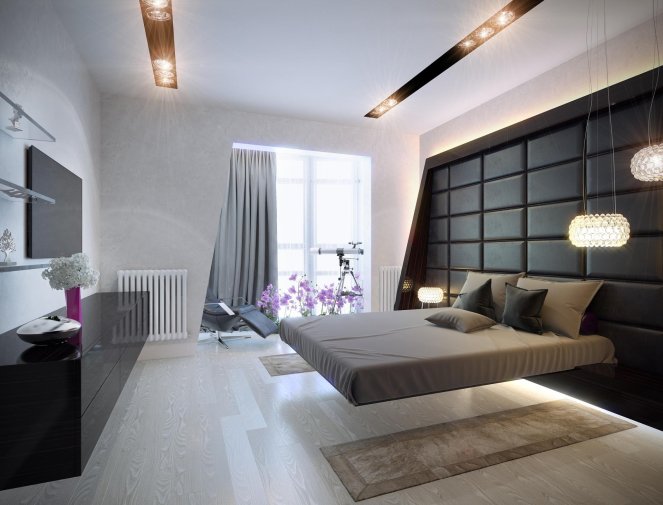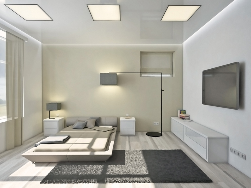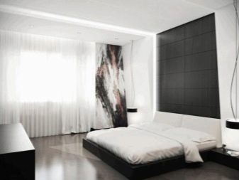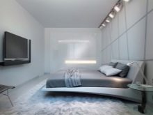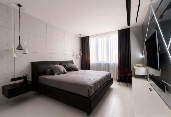 Монохромната спалня изглежда доста скромна, но в същото време порази със своята атмосфера. Акцентът може да се направи с помощта на осветление: под леглото, в рафтовете или на тавана.