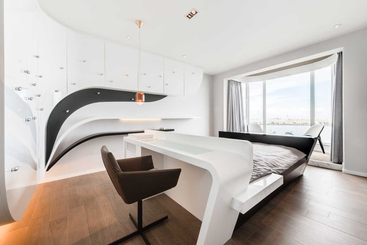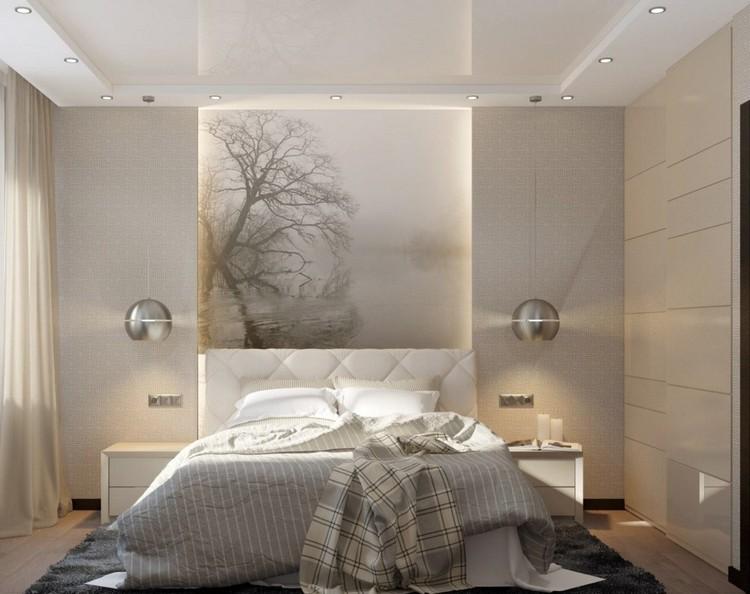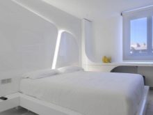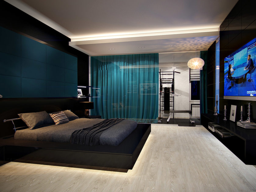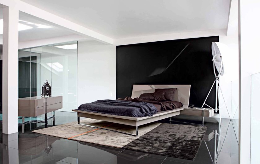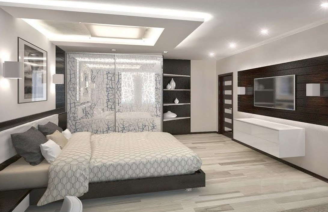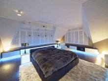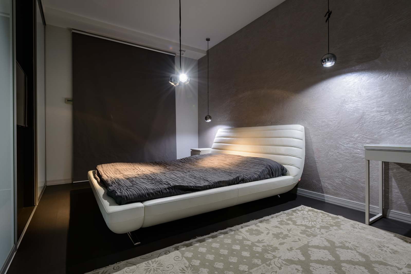 Монохромната спалня изглежда доста скромна, но в същото време порази със своята атмосфера. Акцентът може да се направи с помощта на осветление: под леглото, в рафтовете или на тавана.
