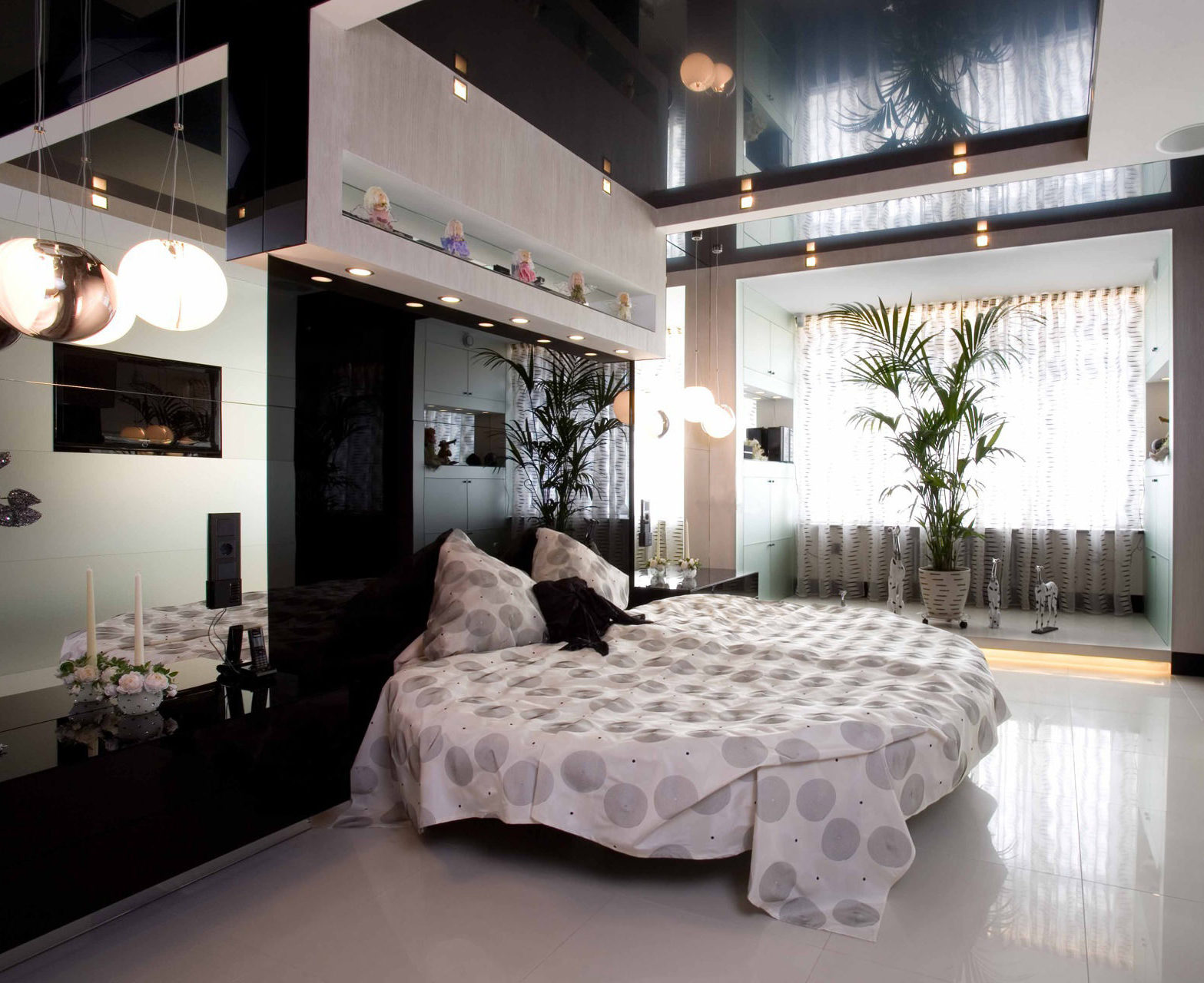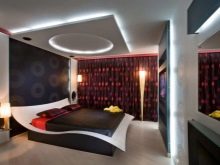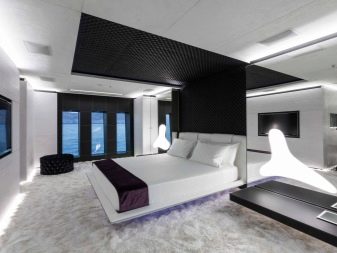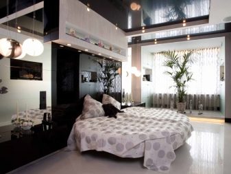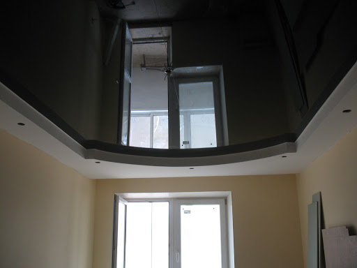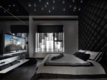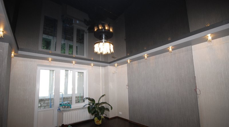 Декорацията на тавана е най -трудната. Дизайнерите съветват да не се пестят пари - и да поръчат черен лъскав опънат таван. Той има много предимства: